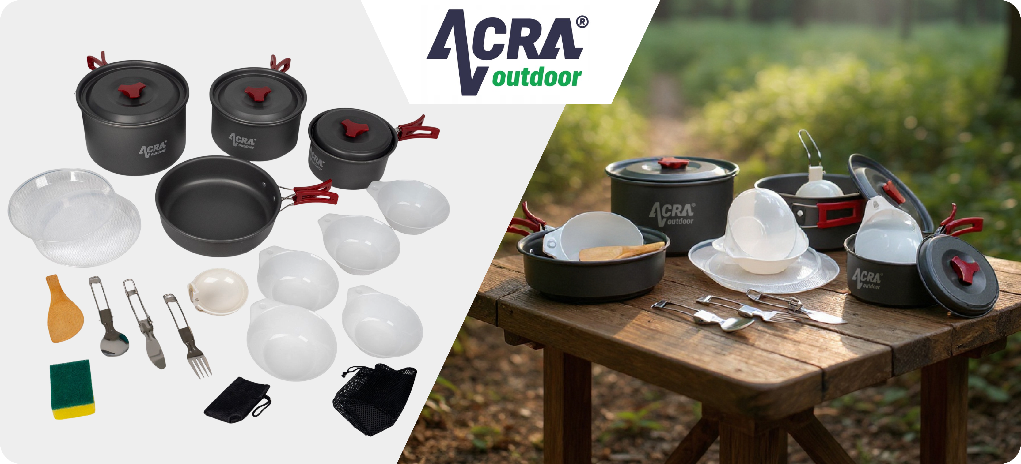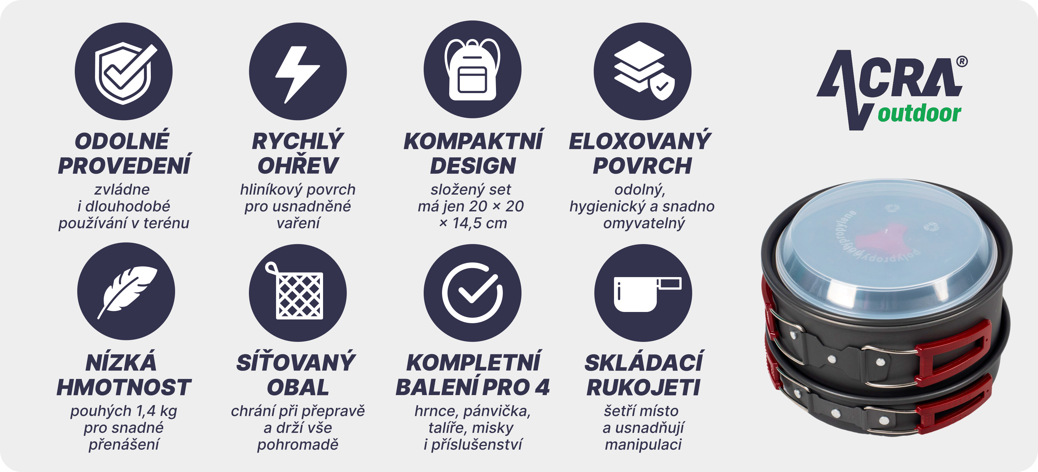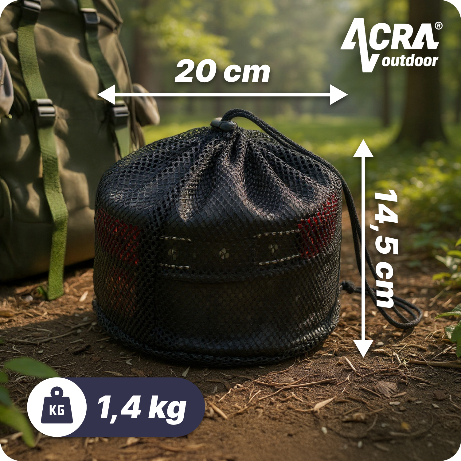 ACRA C22 je kompletní ultralehká sada nádobí navržená pro pohodlnou přípravu jídel až pro čtyři osoby. Díky odolné konstrukci z hliníkové slitiny s tvrdým povrchem zvládne i náročné podmínky, a přitom se snadno čistí. Celá sada je navržena tak, aby se složila do kompaktního balení, které se vejde i do menšího batohu. 🎒