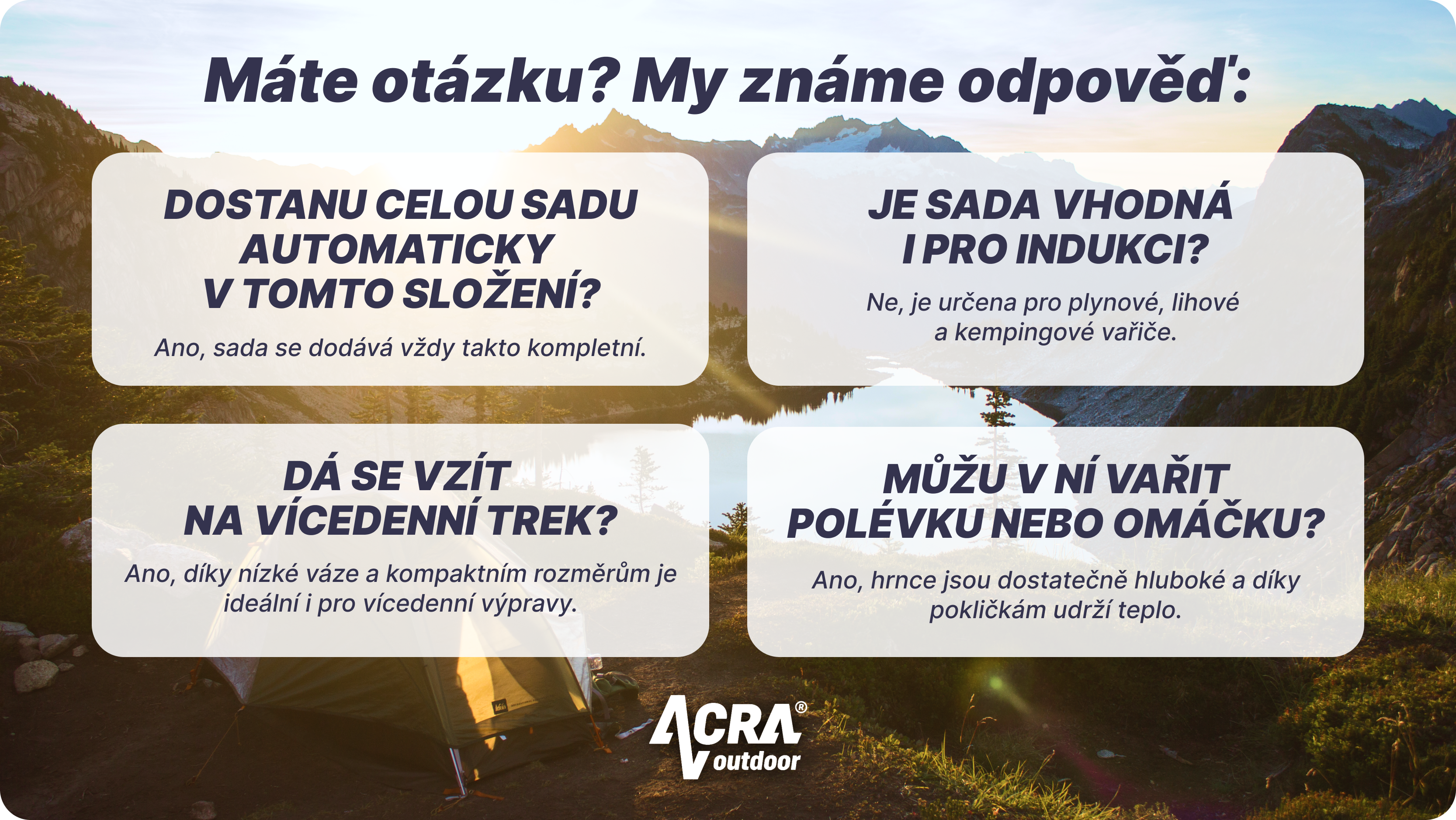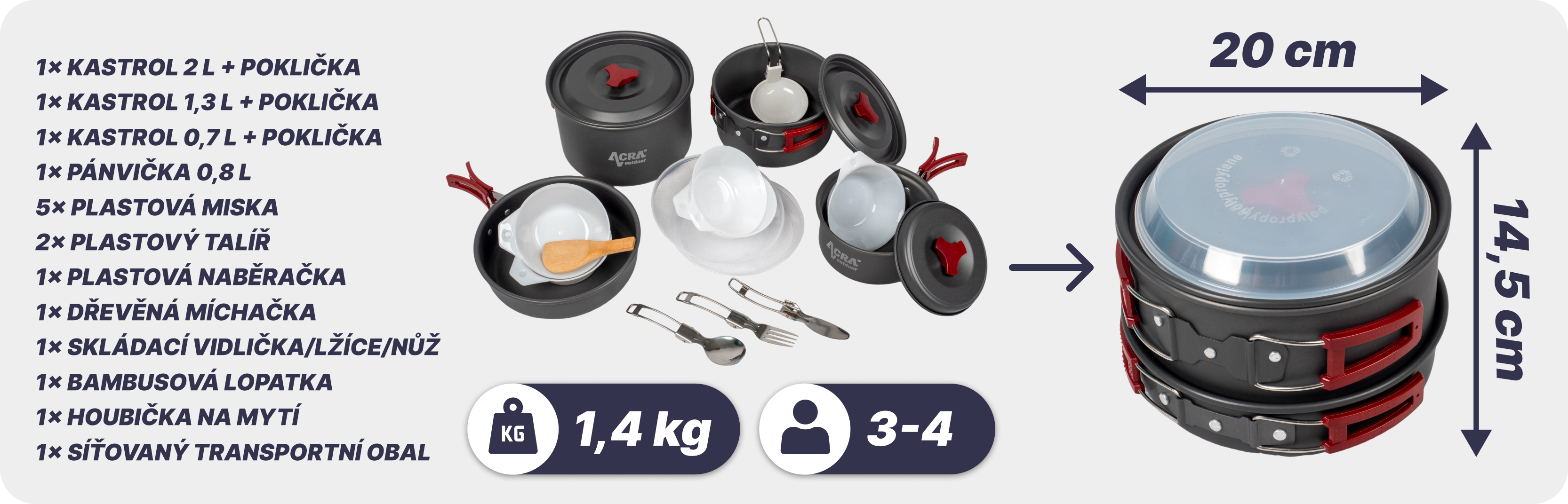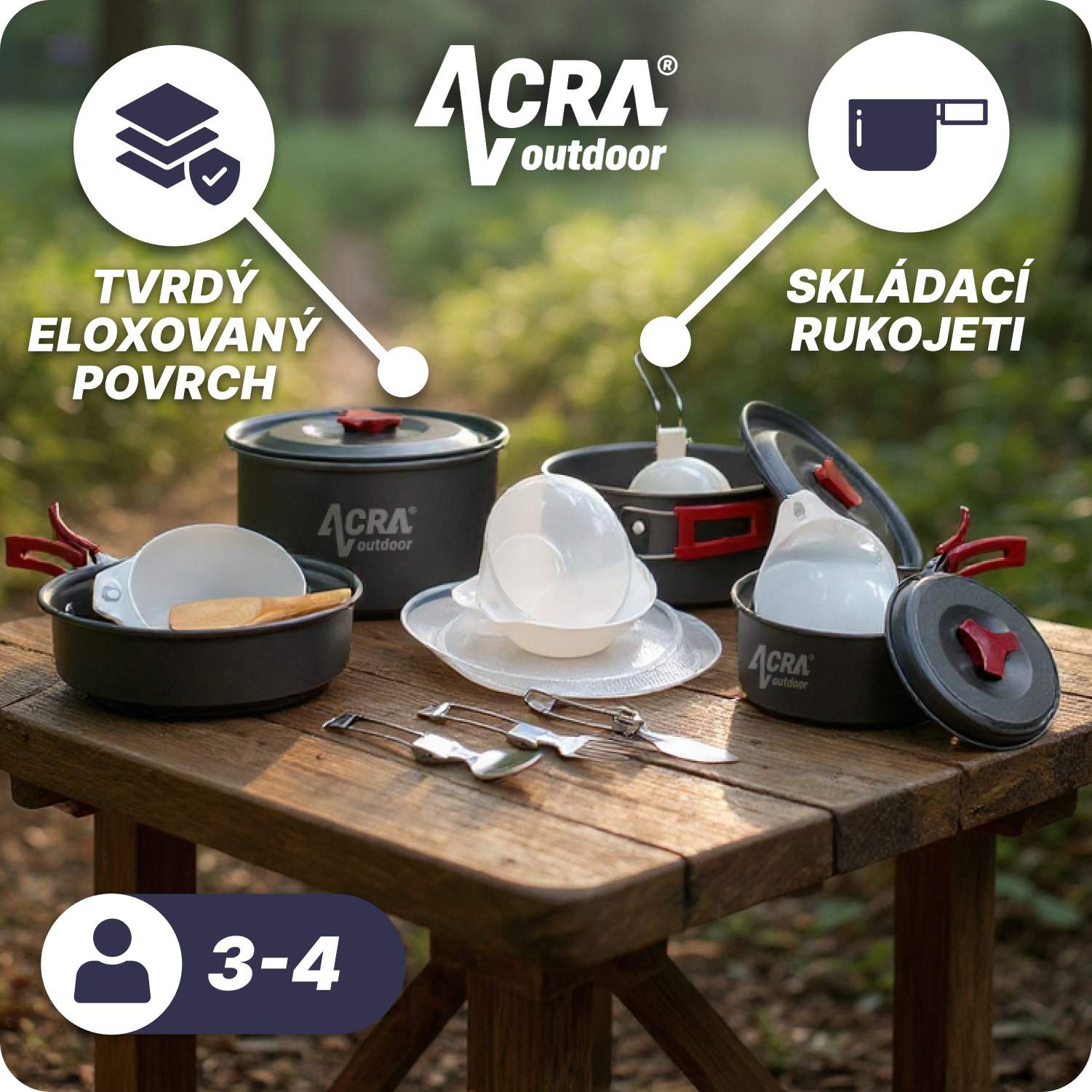 ACRA C22 je kompletní ultralehká sada nádobí navržená pro pohodlnou přípravu jídel až pro čtyři osoby. Díky odolné konstrukci z hliníkové slitiny s tvrdým povrchem zvládne i náročné podmínky, a přitom se snadno čistí. Celá sada je navržena tak, aby se složila do kompaktního balení, které se vejde i do menšího batohu. 🎒