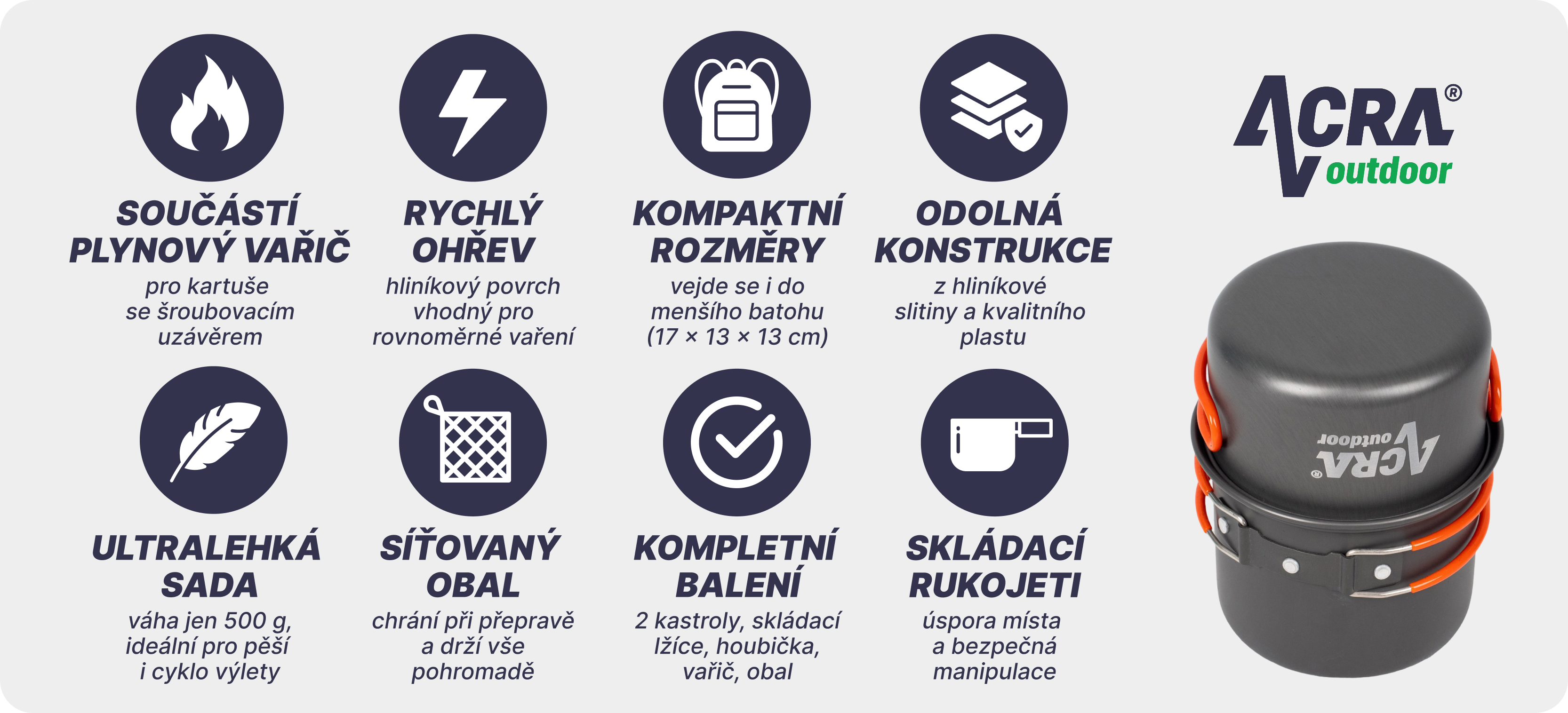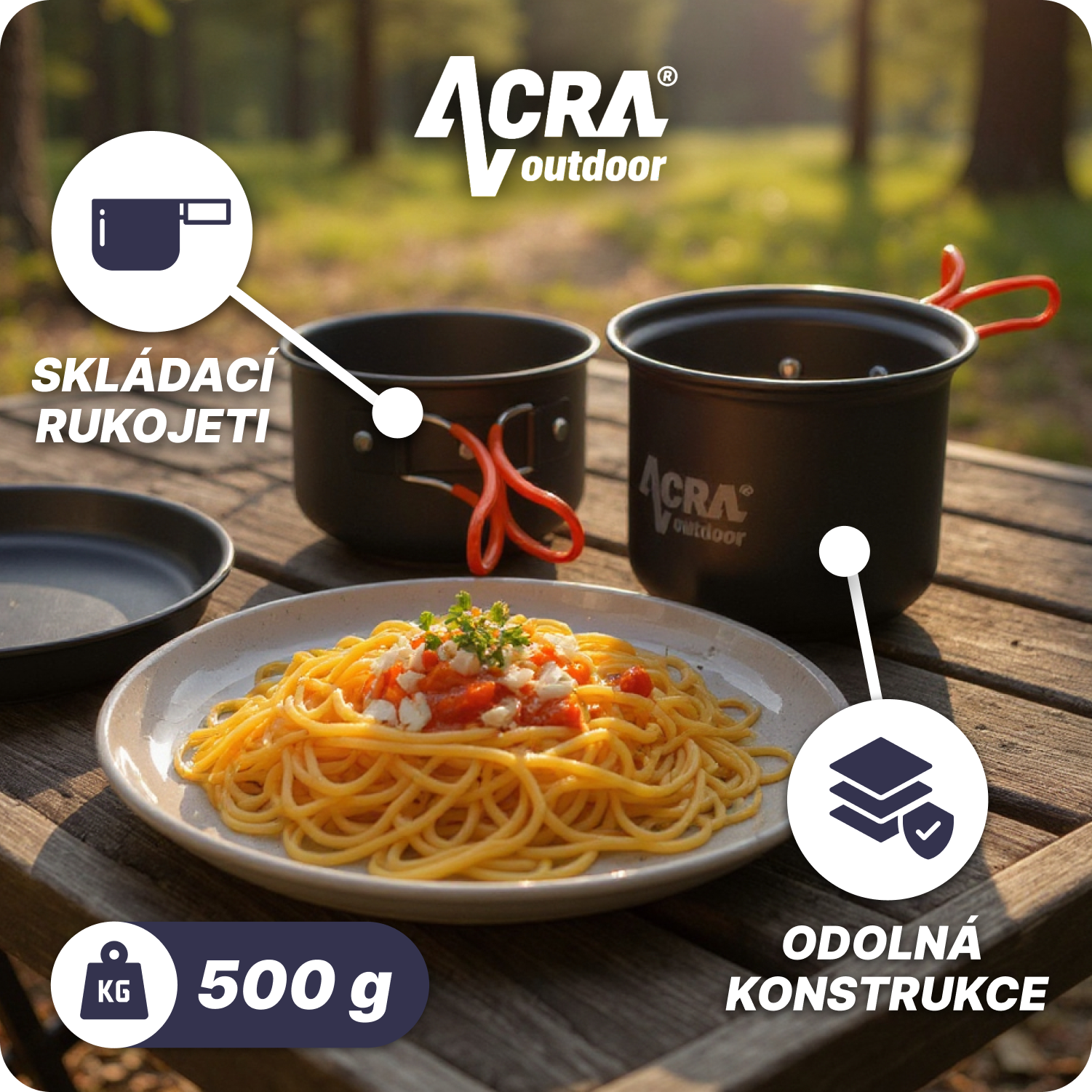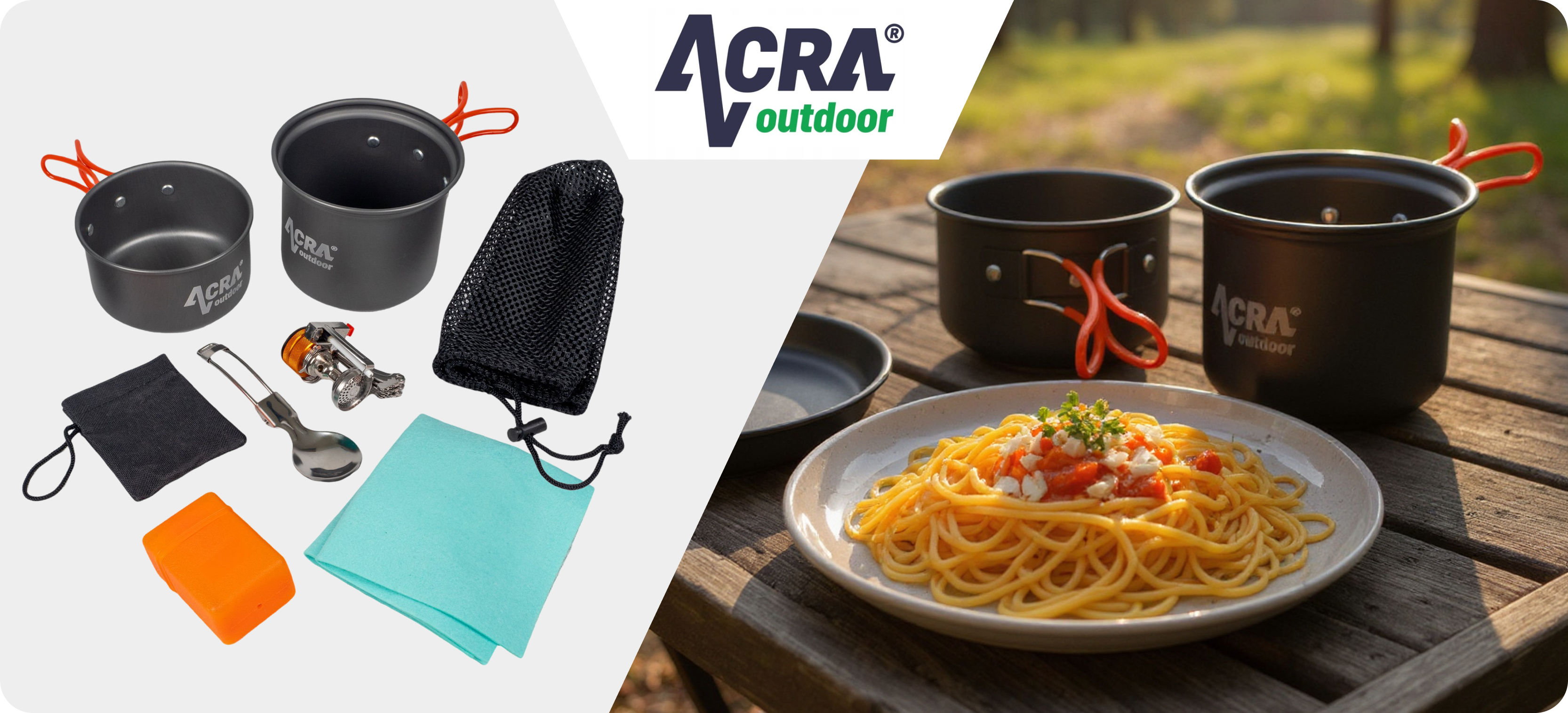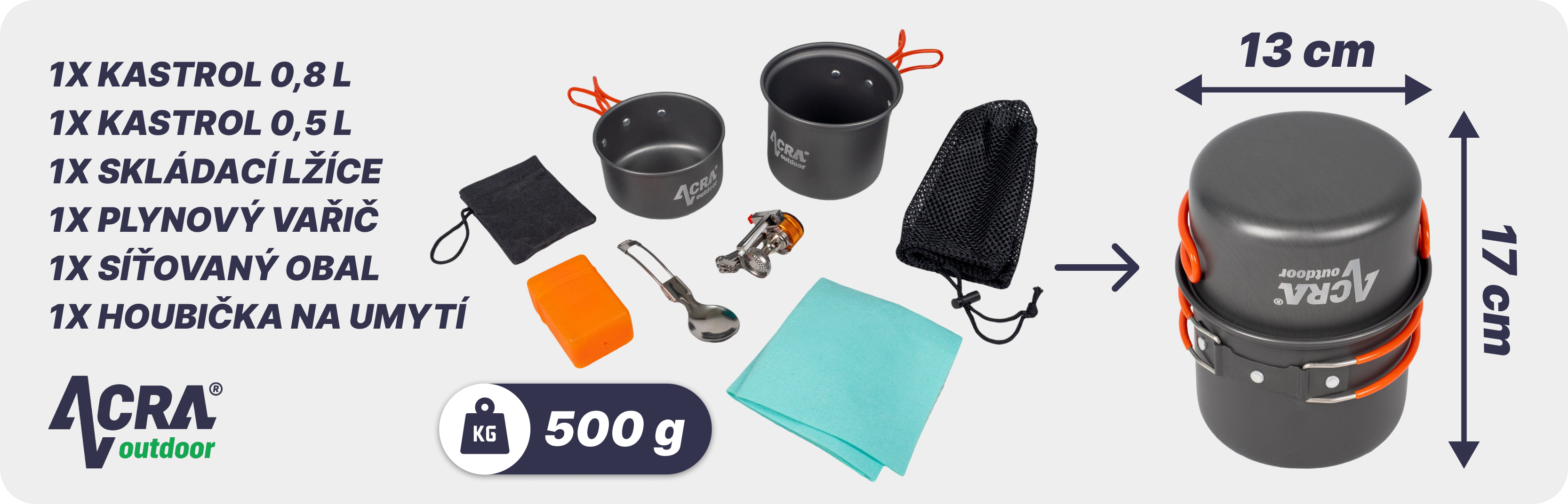 ACRA C23 je kompaktní a ultralehká sada nádobí s plynovým vařičem, ideální pro krátké turistické výpravy, kempování, cykloturistiku i víkendové pobyty v přírodě. Obsahuje vše potřebné pro přípravu jídla pro 1–2 osoby, a díky odolným a lehkým materiálům se snadno přenáší. 🔝
