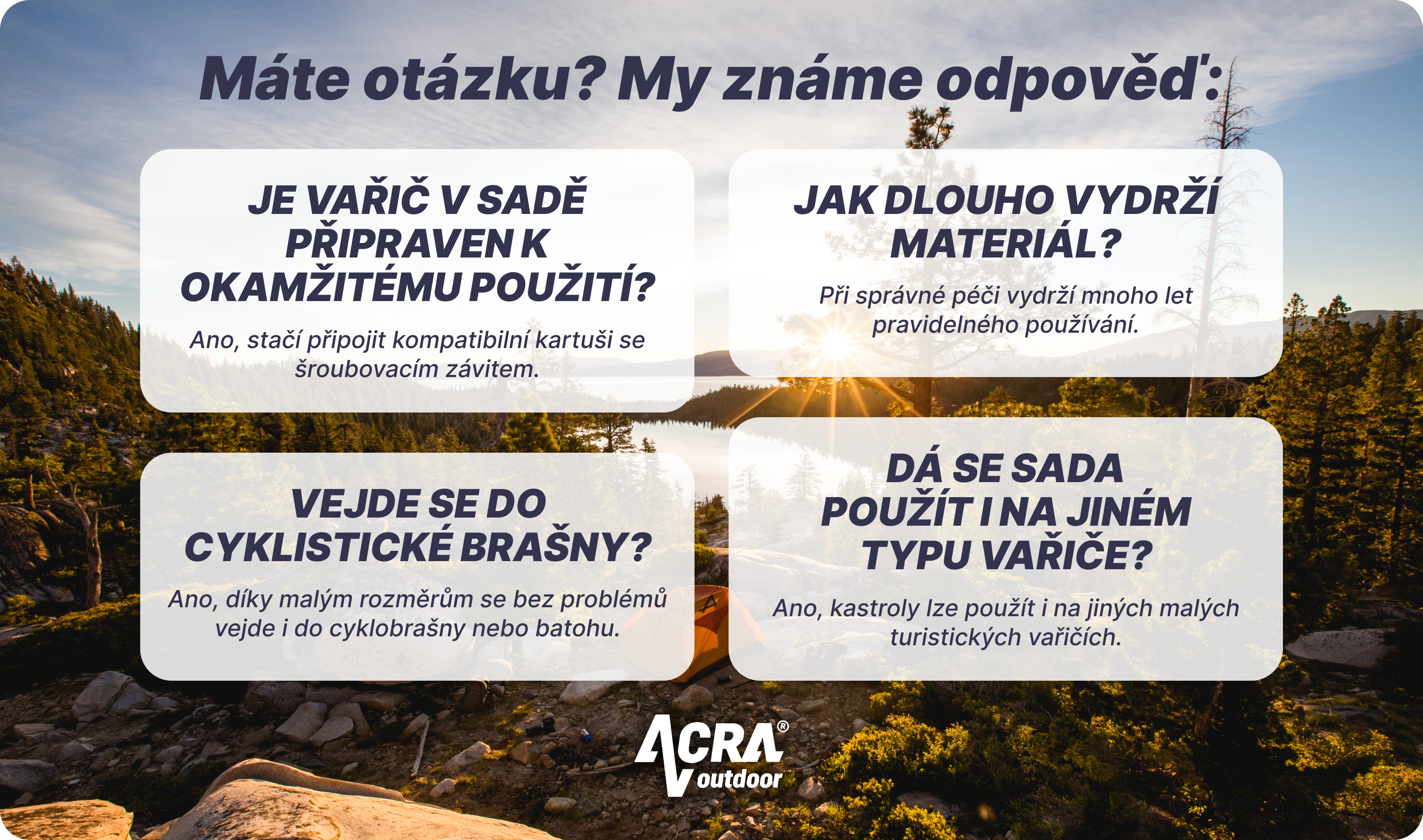 ACRA C23 je kompaktní a ultralehká sada nádobí s plynovým vařičem, ideální pro krátké turistické výpravy, kempování, cykloturistiku i víkendové pobyty v přírodě. Obsahuje vše potřebné pro přípravu jídla pro 1–2 osoby, a díky odolným a lehkým materiálům se snadno přenáší.