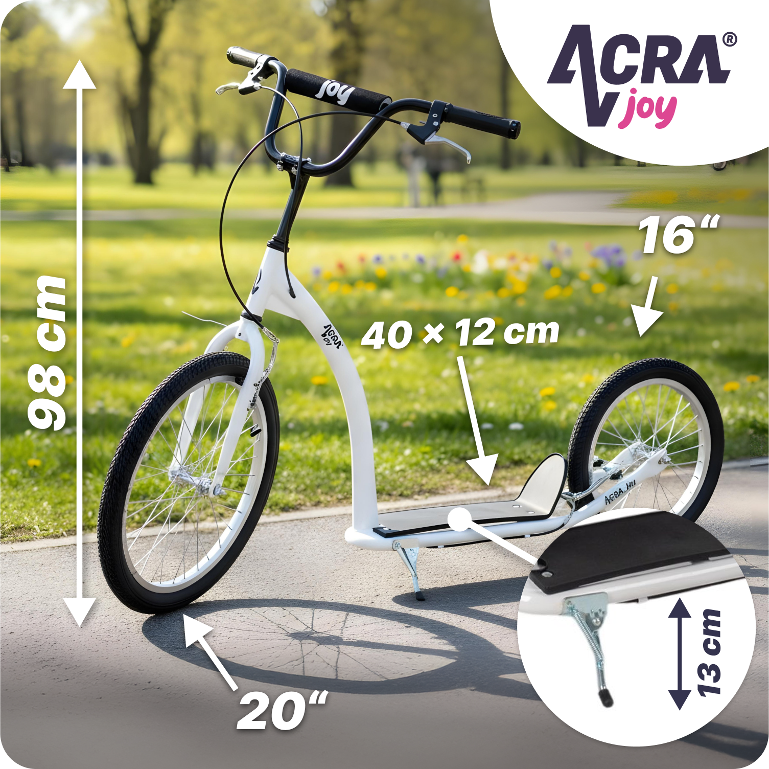 Koloběžka Acra Joy Aven je rychlá, sportovní, ideální pro jízdu po silnici, cyklostezce i v menším terénu. Je vhodná pro jezdce všech úrovní a je ideální nejen pro dojíždění do práce nebo školy, ale i pro zábavu a volný čas i pro výlety do terénu.