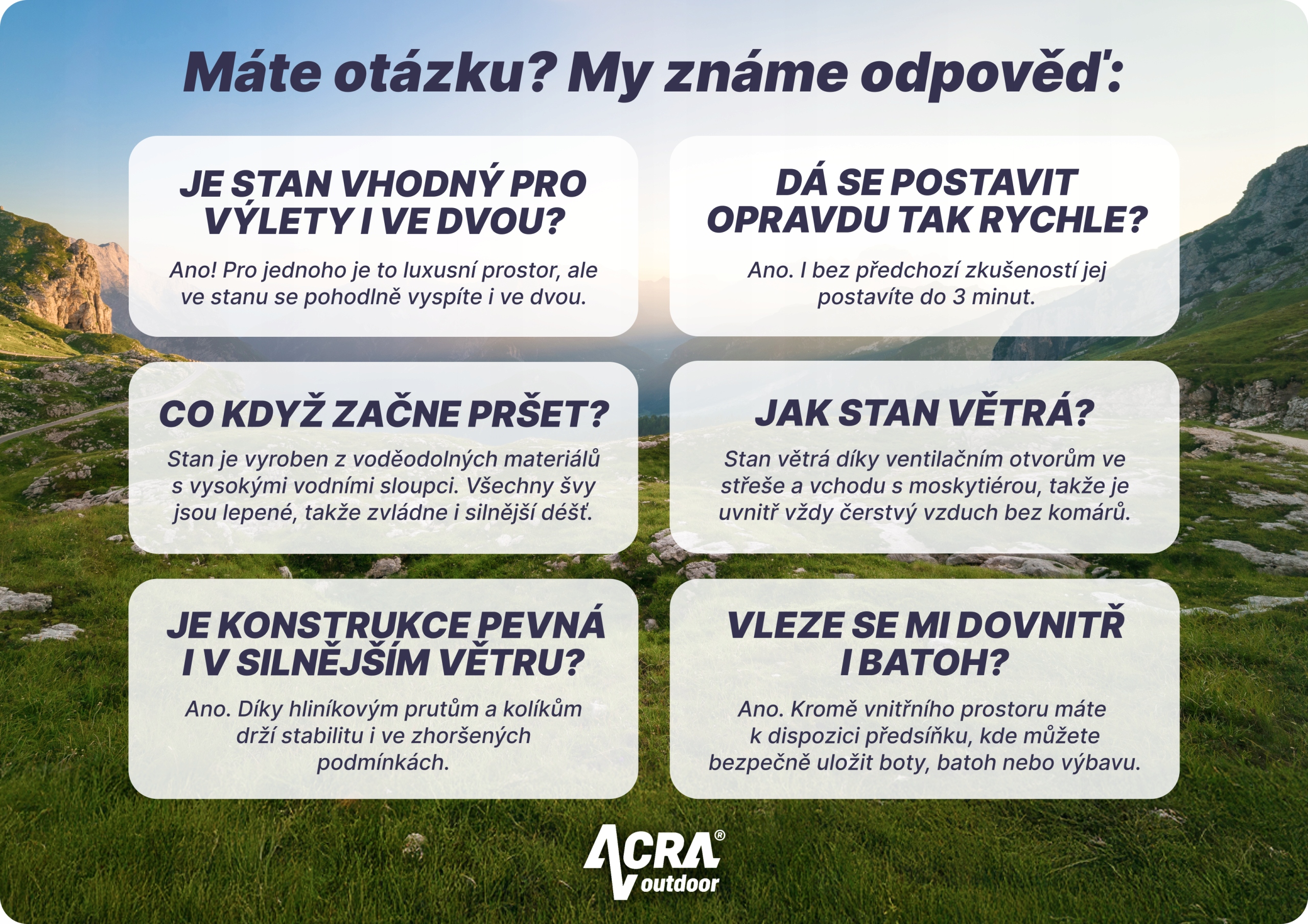 Představujeme vlajkovou loď naší stanové kolekce! Tento stan vás nezatíží při žádném výletu, zato vás ochrání v každém terénu.