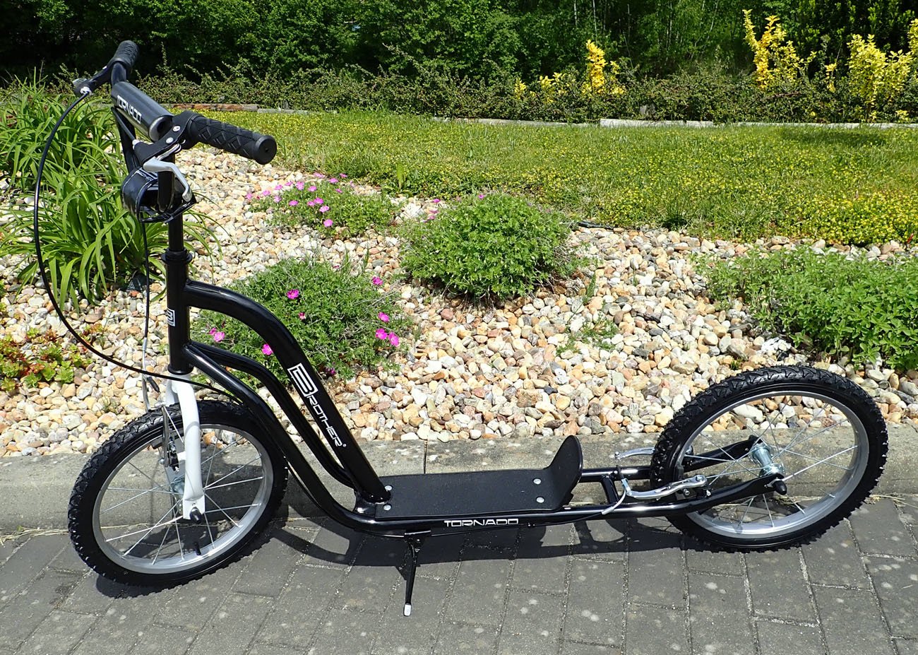 Koloběžka pro děti i dospělé. Doporučené od 9 let, nosnost 90 kg. Rám Hi-tech vyztužená ocel. Pneumatiky 16" + 16" nafukovací, ráfky - ocelové zušlechtěné, max.