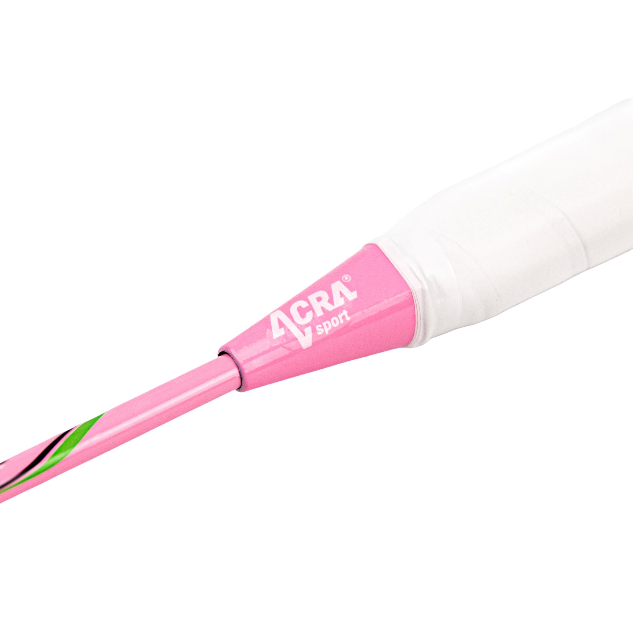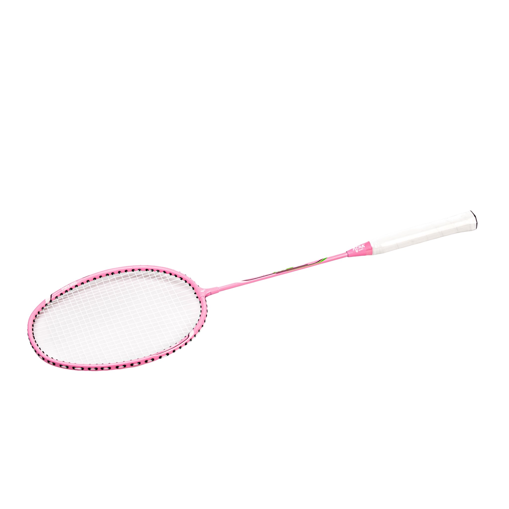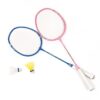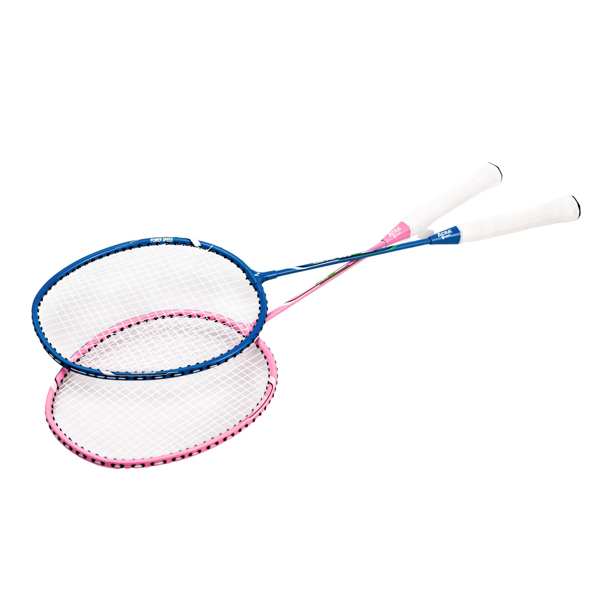 2 badmintonové rakety: Rakety jsou provedeny v atraktivních barvách – jedna s dominantními růžovými a bílými prvky, druhá s modrými a bílými.