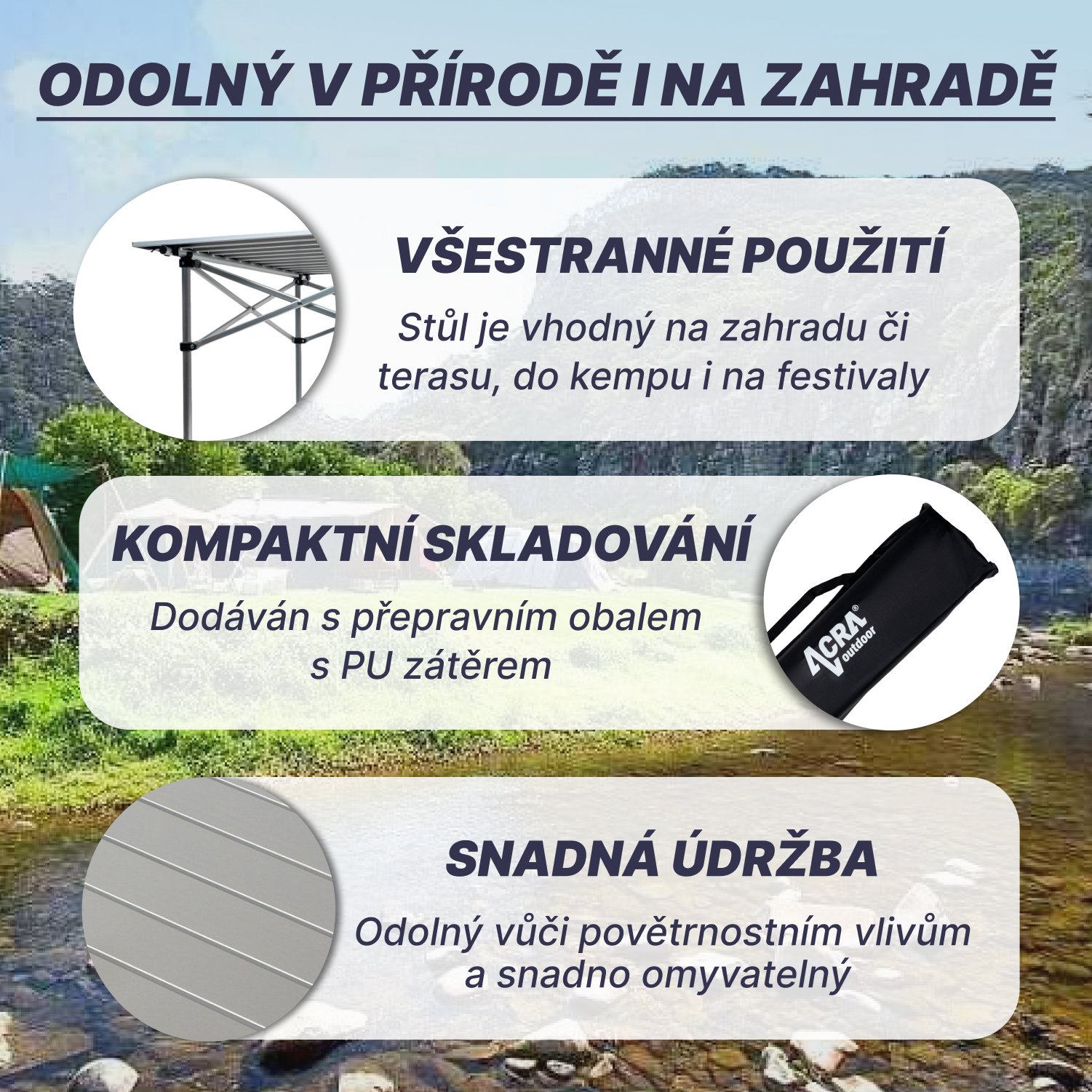 - Odolná konstrukce: Pevná hliníková konstrukce zaručuje stabilitu stolu i při nerovném terénu.