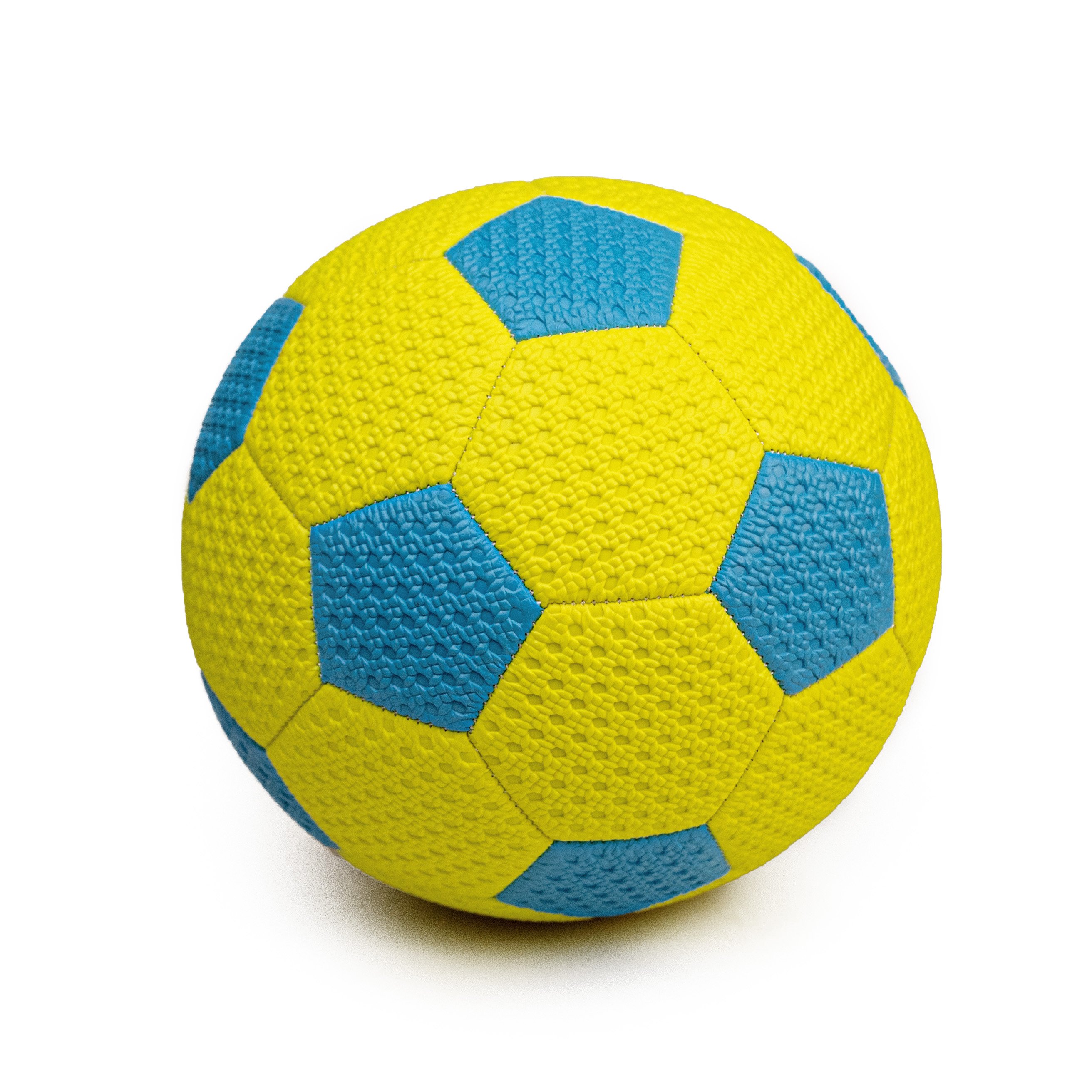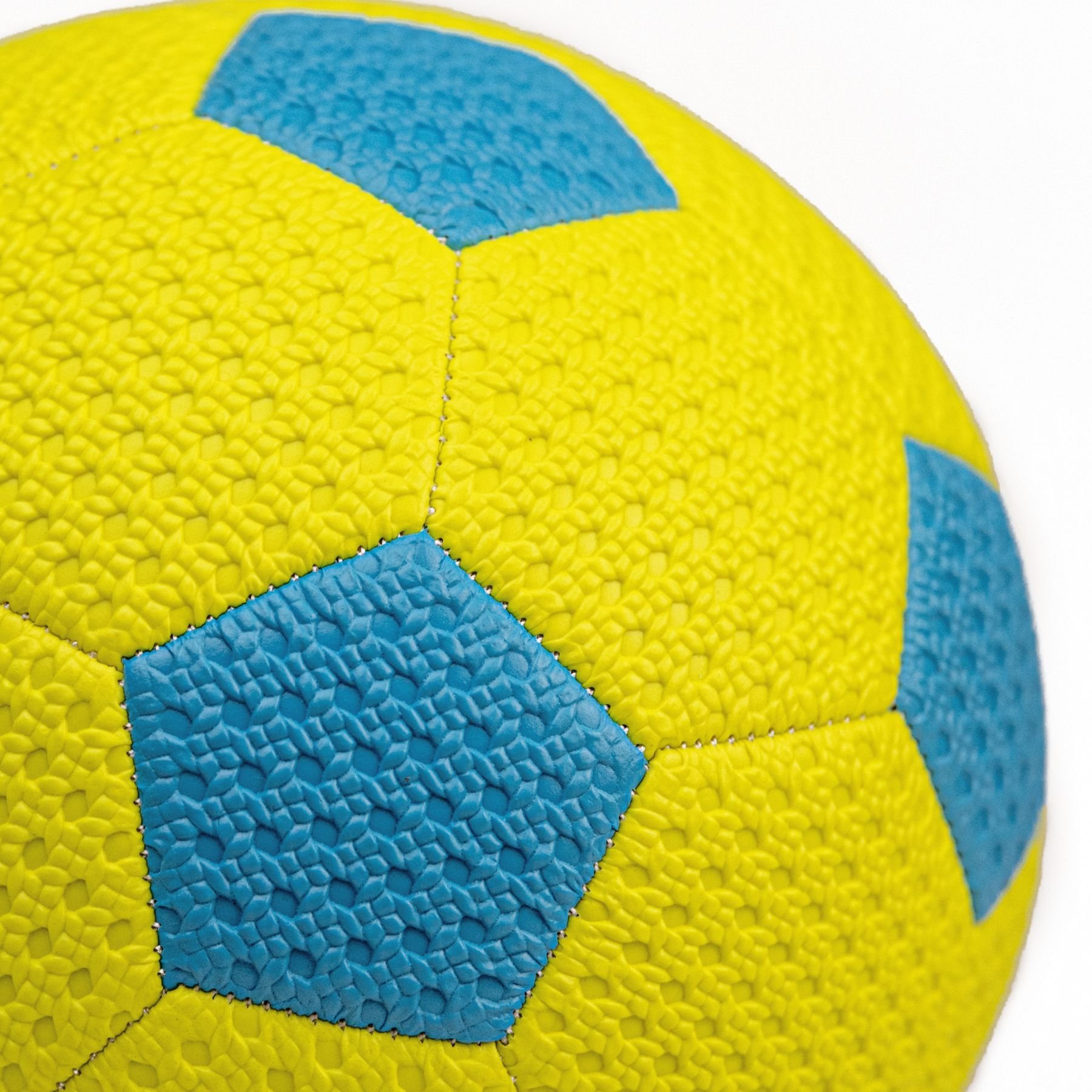 Odolný materiál (PVC): Míč je vyroben z kvalitního a trvanlivého PVC materiálu, který odolává opotřebení a zaručuje dlouhou životnost. Povrch s texturou (jak je vidět na obrázku – malé výstupky na žlutých plochách) zlepšuje úchop a kontrolu míče.