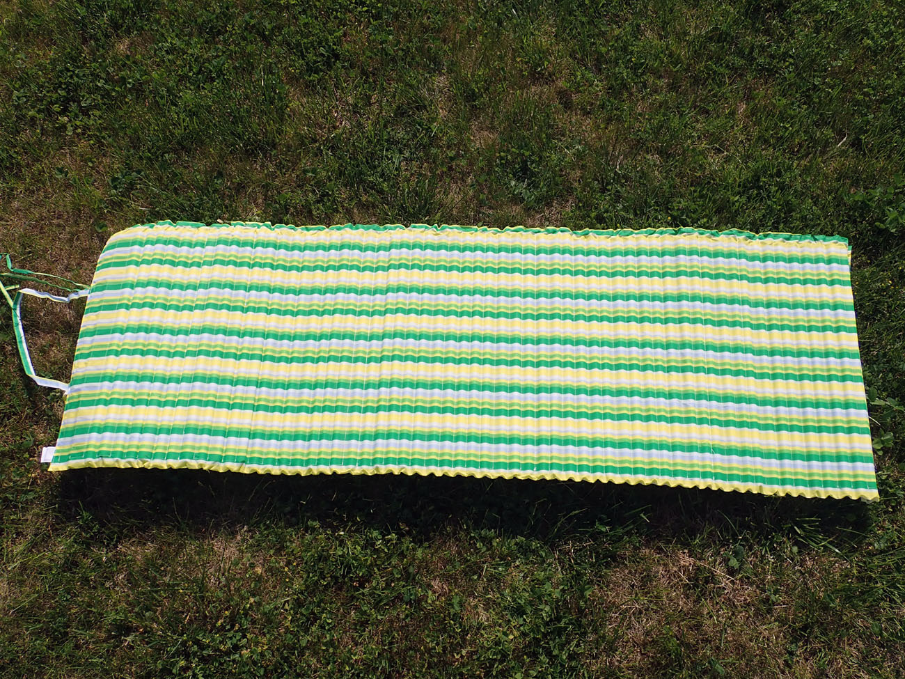 Plážové rolovací lehátko zelené - nový a velmi skladný typ lehátka o rozměru 170 x 55 x 1,5 cm. Výplní jsou trubky z nenasáklivého molitanu, do sebe vzájemně zapadající a umožňující úsporné složení lehátka do úhledného balíčku. Rozměr balíčku je 9,5 cm průměr x 55 cm délka. Potah je bavlněný s příměsí polyesteru kvůli omezení nasáklivosti. NEPRAT V PRAČCE, ale pouze ručně v mýdlové vodě. Neždímat!