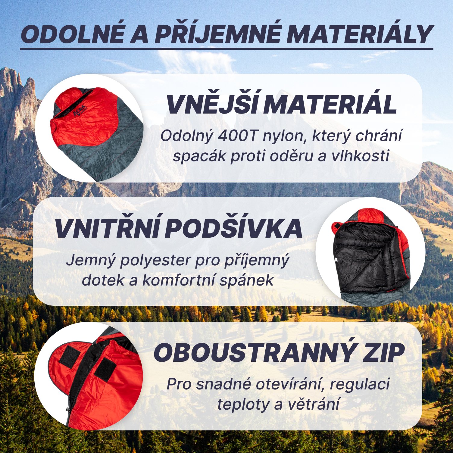 - Prodloužená délka: Spacák je ideální i pro osoby s výškou nad 180 cm, takže si ho užijí i dlouháni.