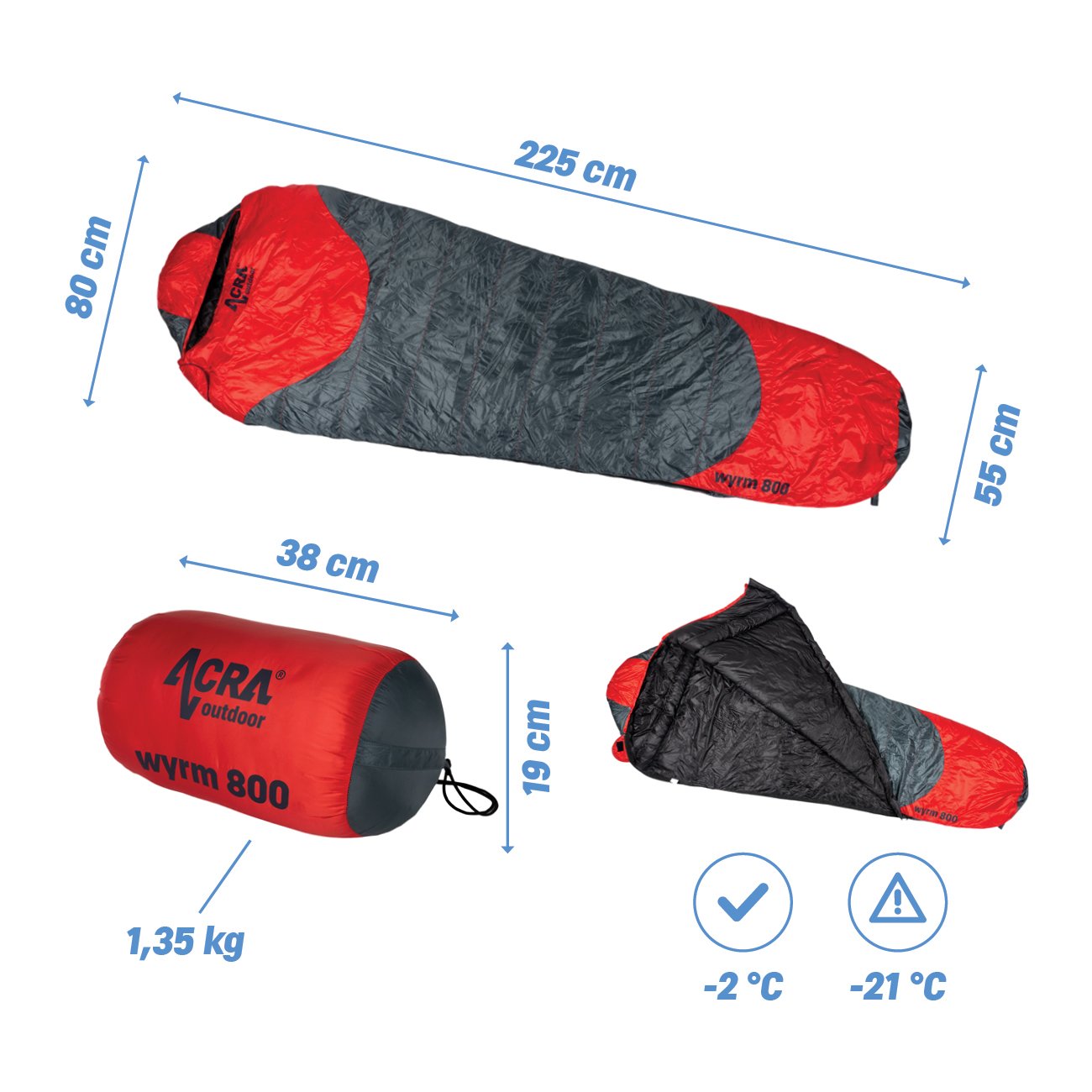 Hledáte spací pytel, který vám zajistí maximální komfort a teplo i v těch nejchladnějších nocích? Pak je Acra Wyrm 800 tou pravou volbou! Náš prémiový spací pytel s mumiovým střihem a kvalitní izolací z kachního peří vám zaručí příjemný a hřejivý spánek na všech vašich outdoorových výpravách.