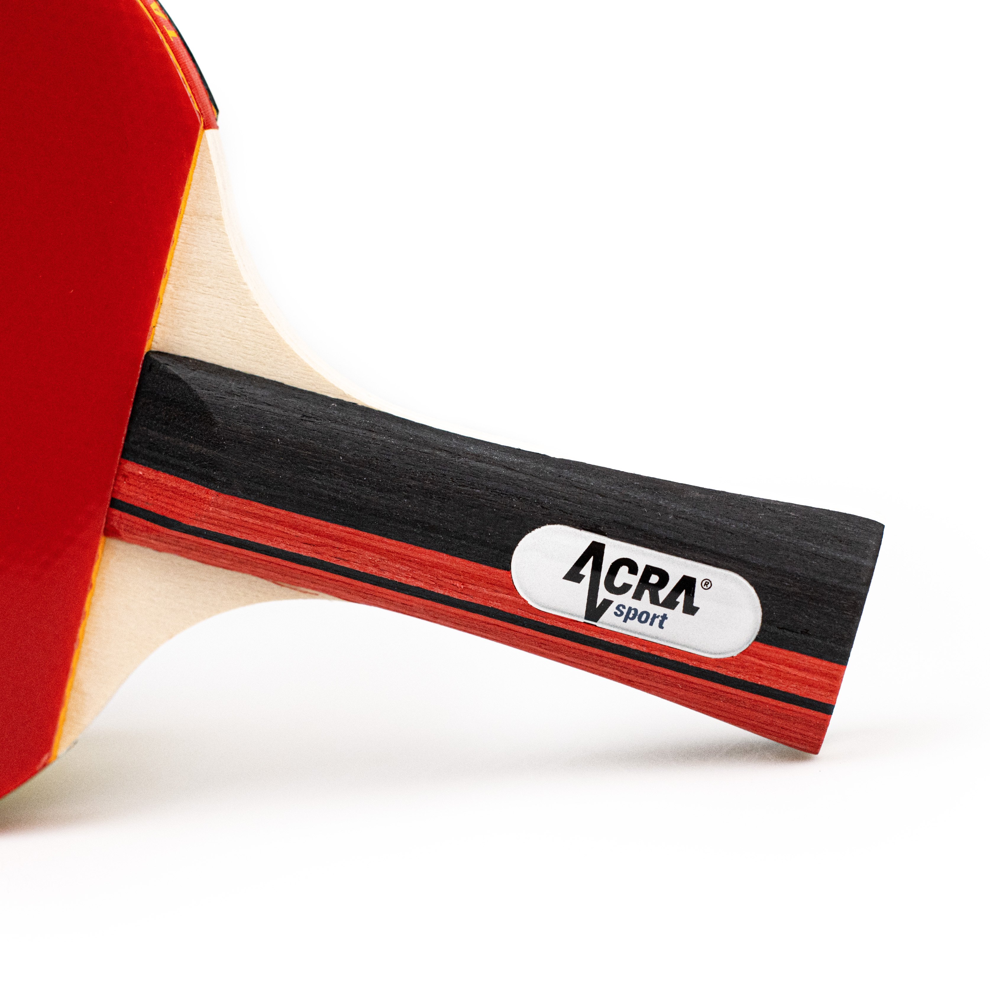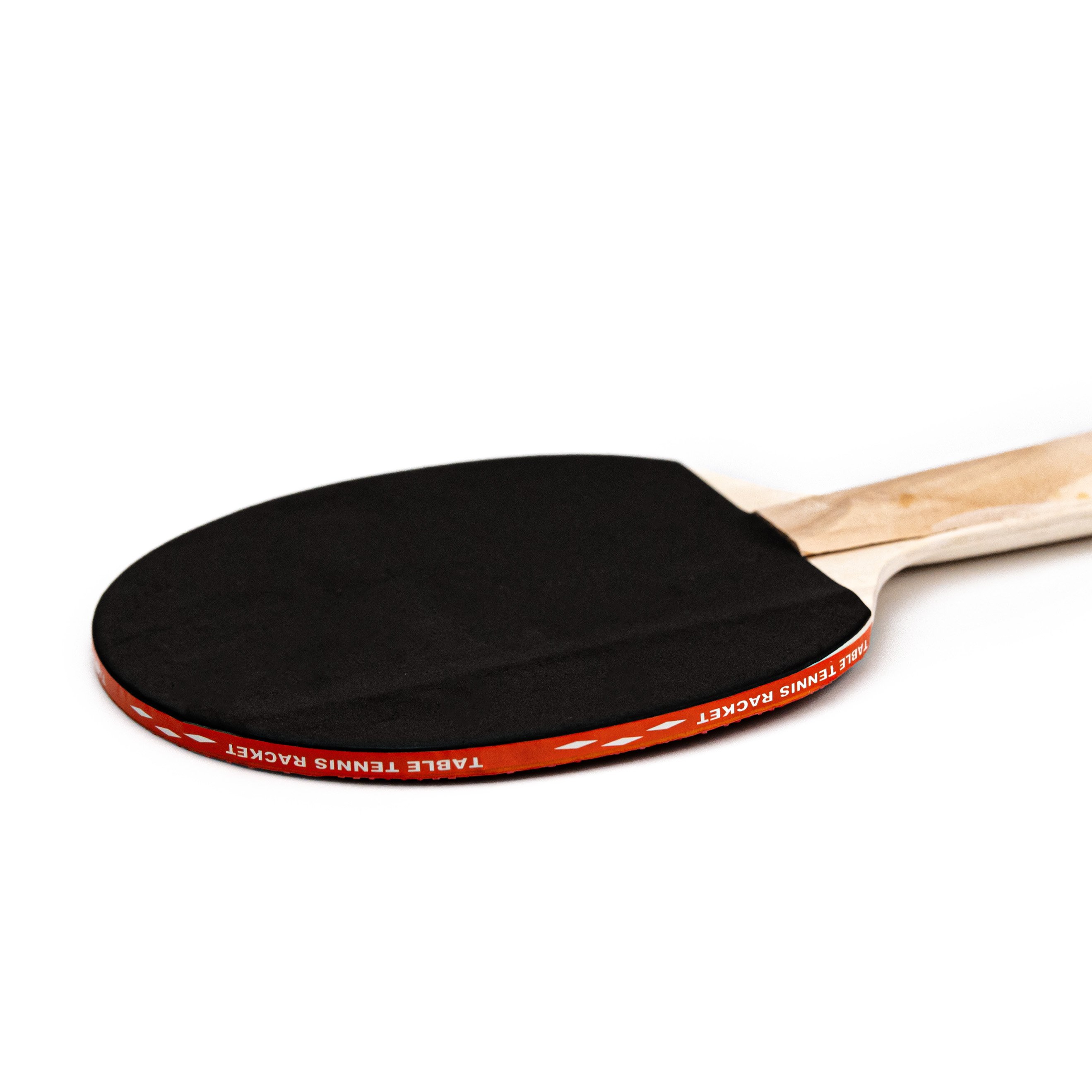 2 pálky na stolní tenis: Jedna pálka s červenou gumou a jedna s černou gumou.