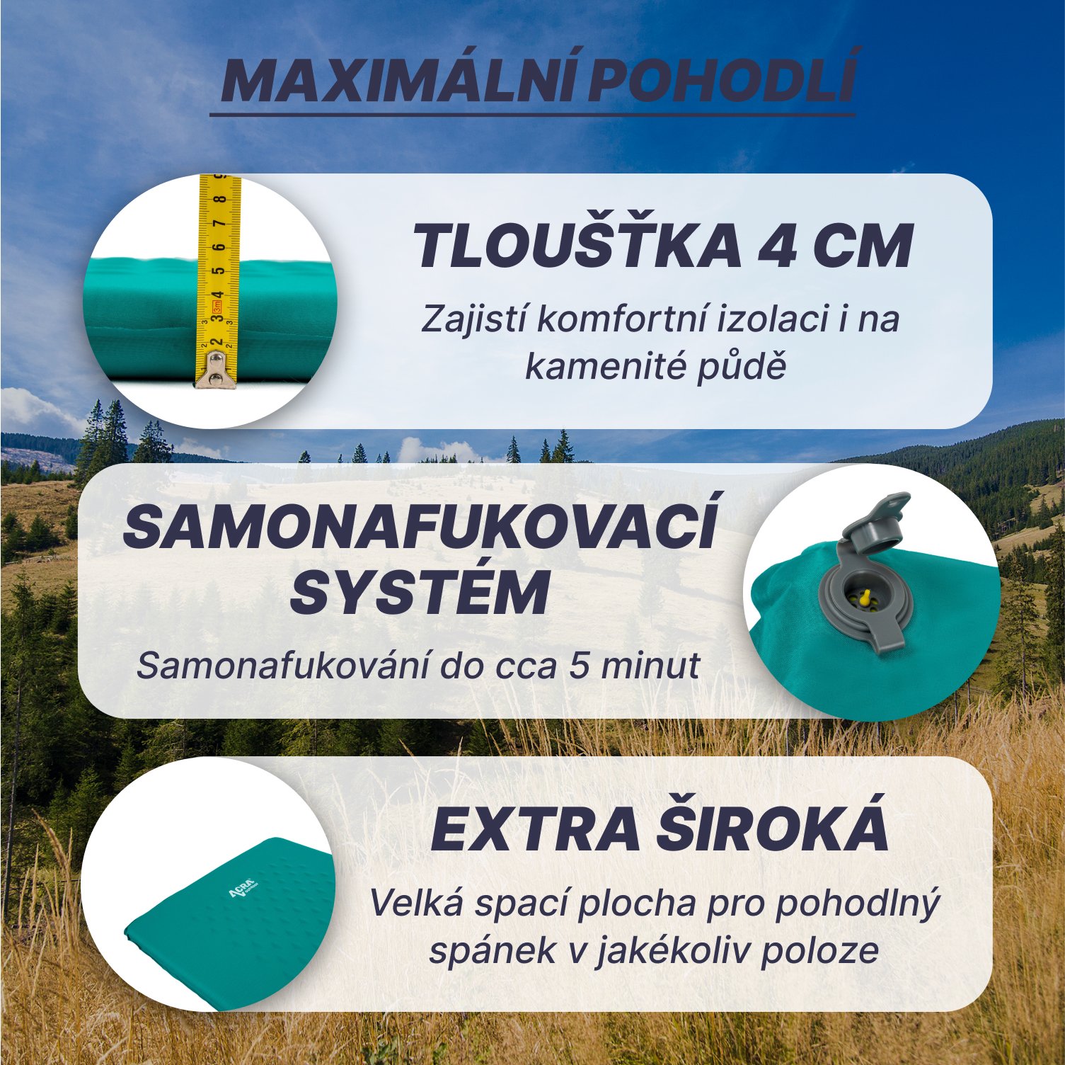 - Pohodlné ležení: Tloušťka 4 cm a velká spací plocha 190 x 68 cm vám zajistí maximální pohodlí i na nerovném terénu.