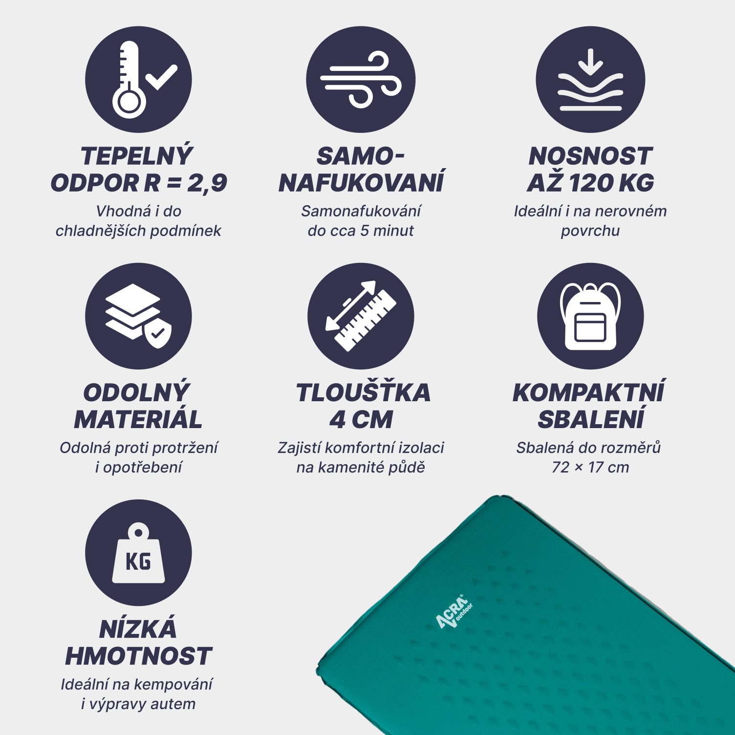 - Nosnost do 120 kg: Karimatka je určena pro osoby s maximální hmotností 120 kg.