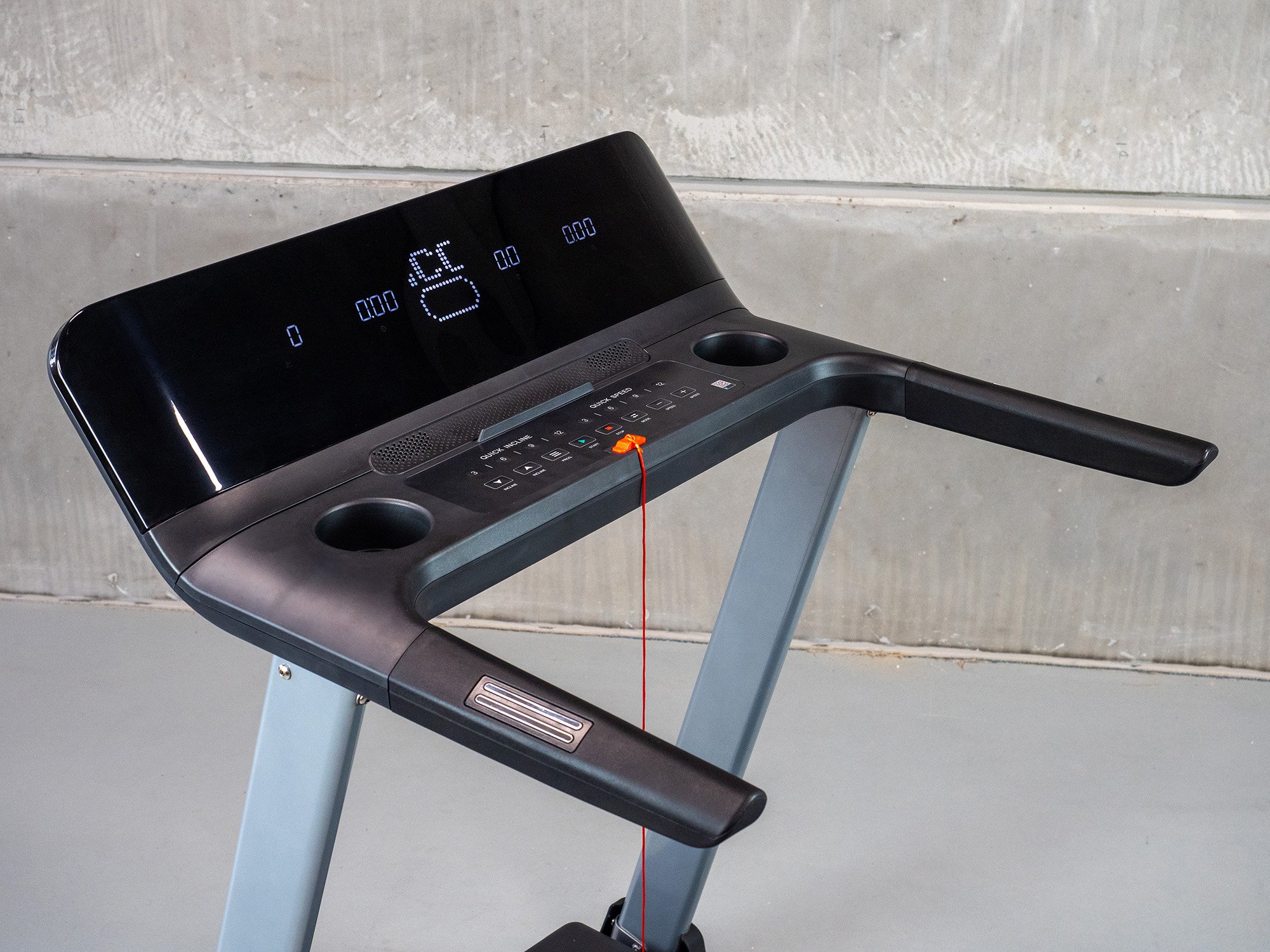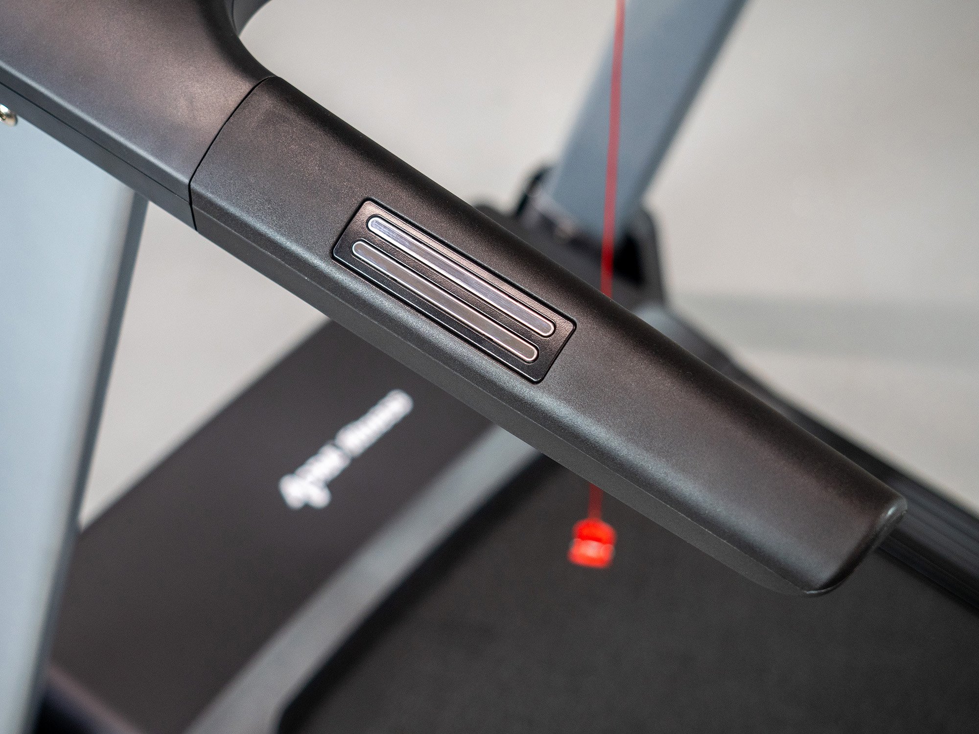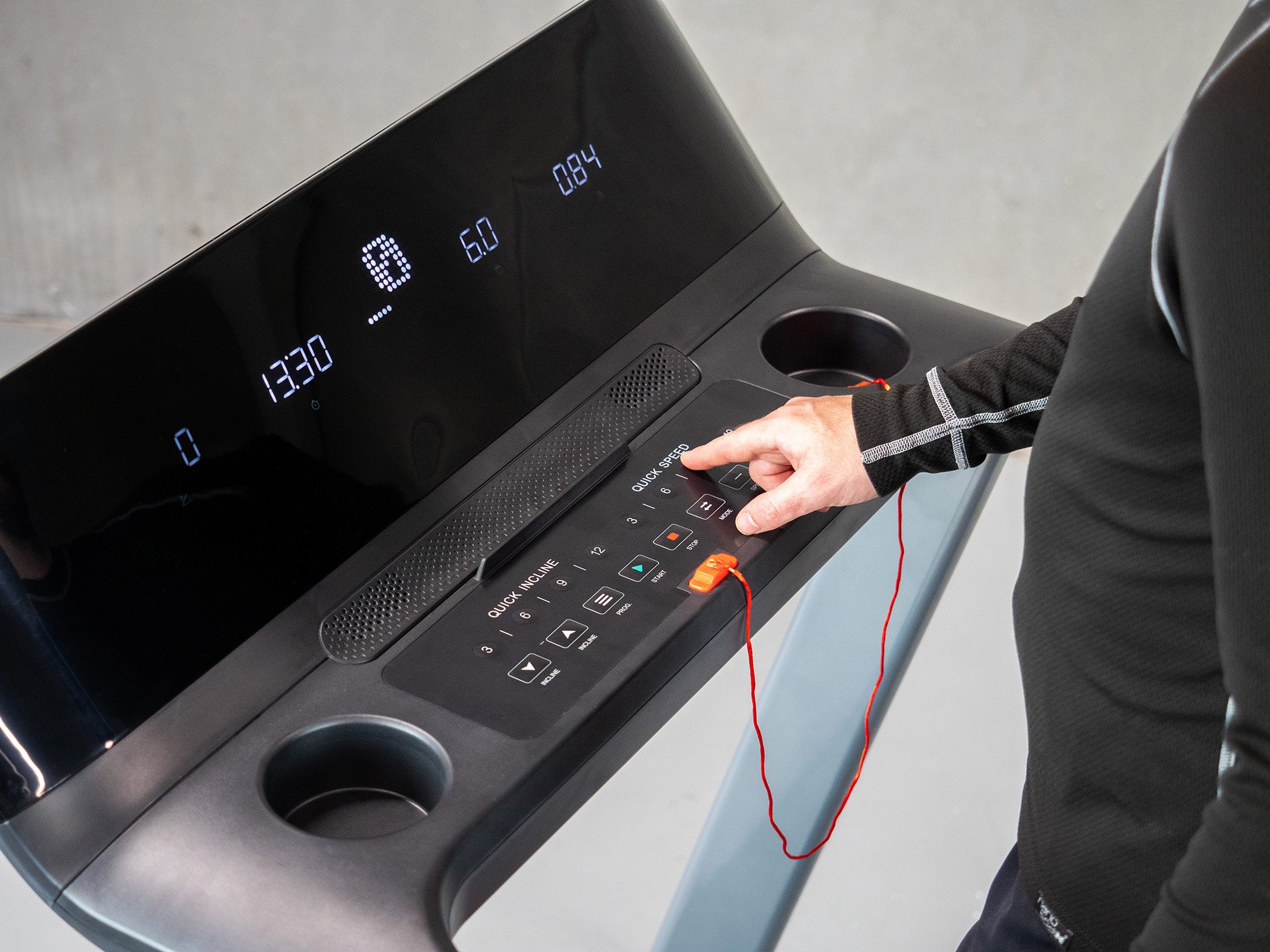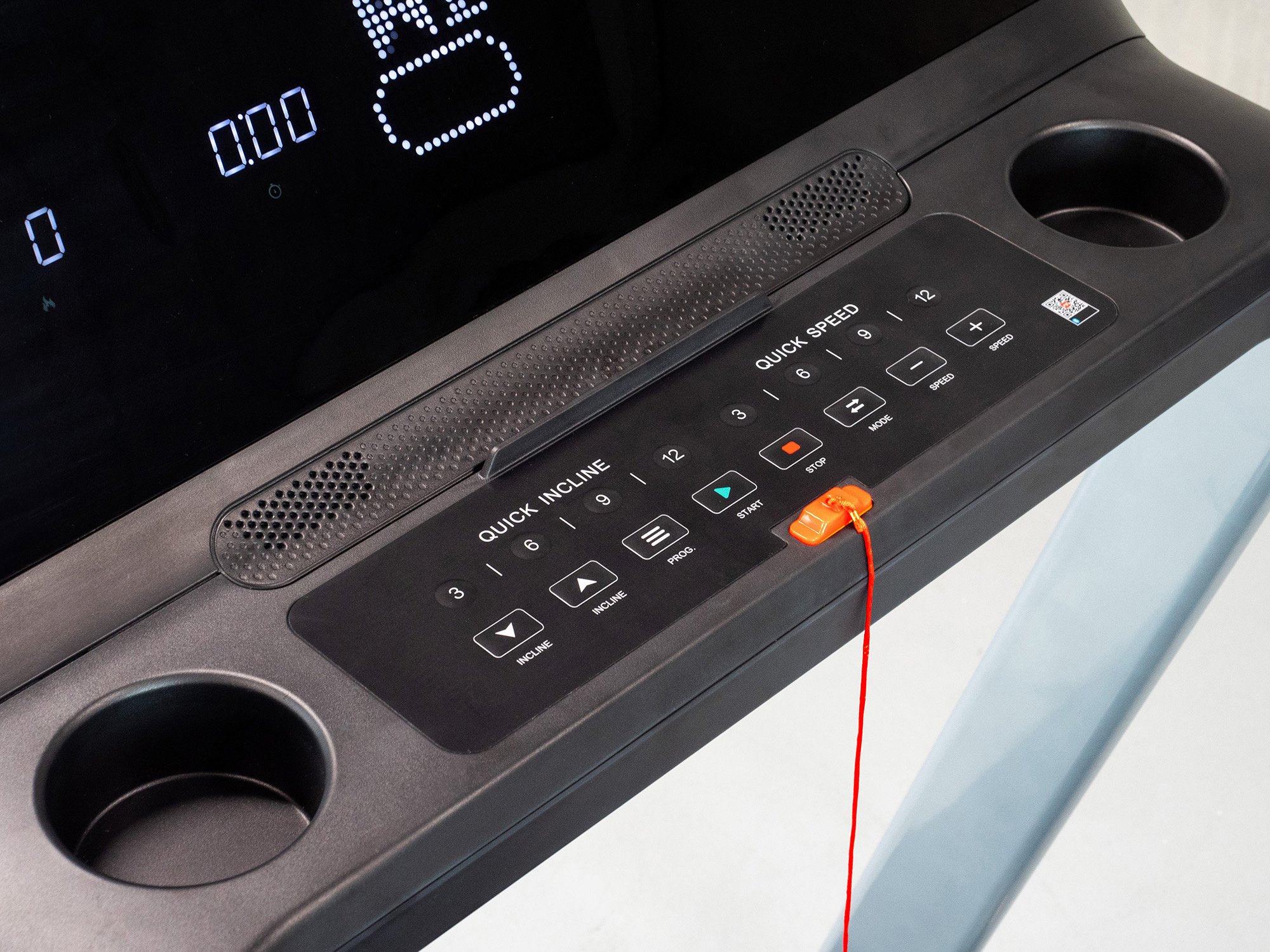 Pás také disponuje bezpečnostní rychlobrzdou, která umožňuje okamžité zastavení v případě potřeby. Sklon pásu lze elektricky nastavit v rozmezí 0-15 % přímo z obrazovky, což umožňuje plynulou změnu během běhu.
