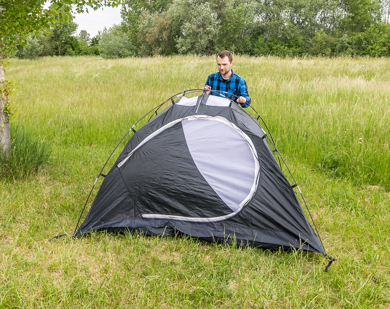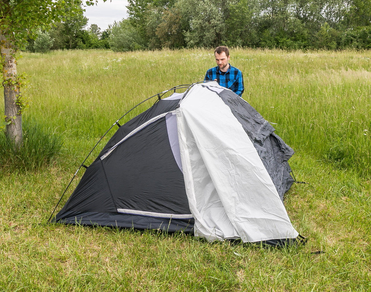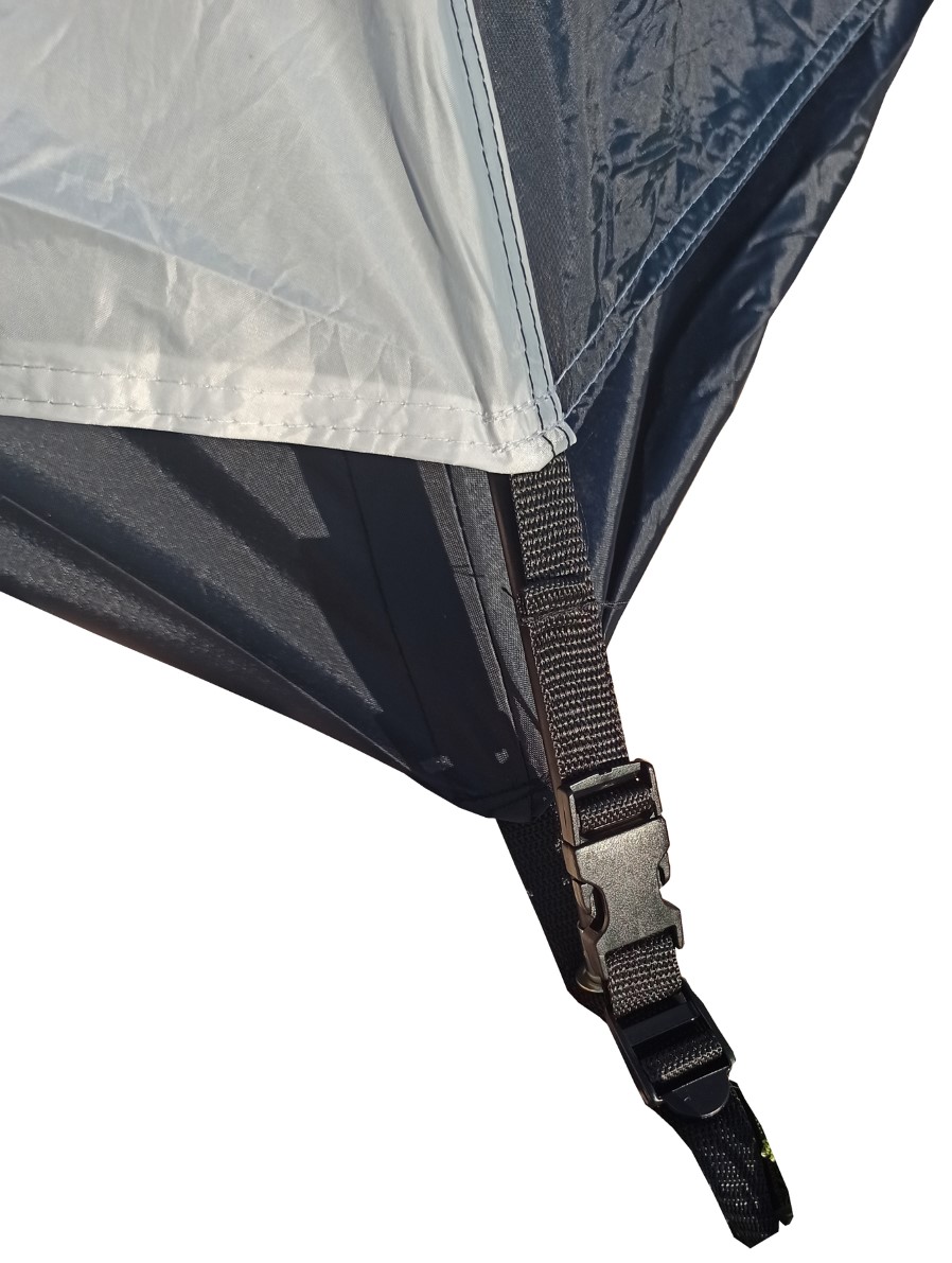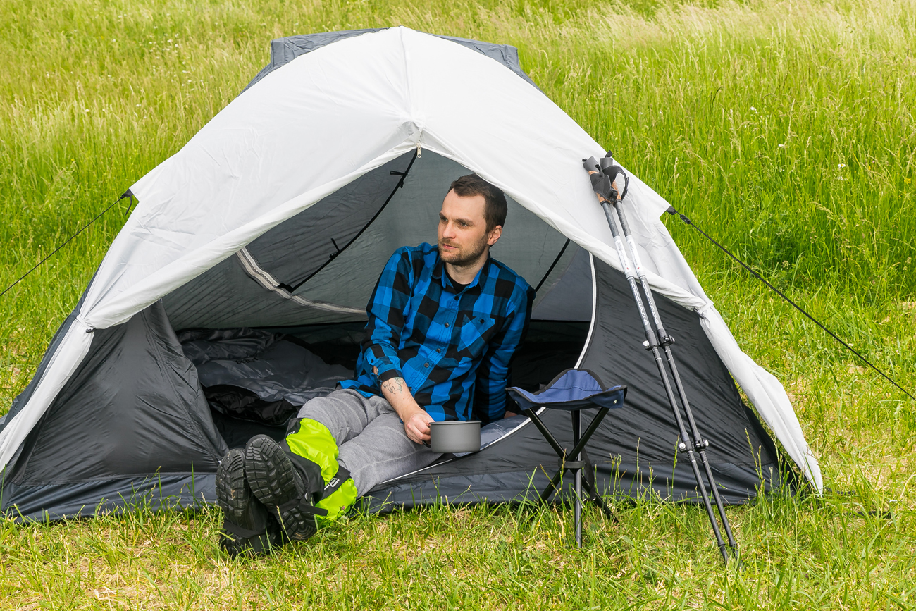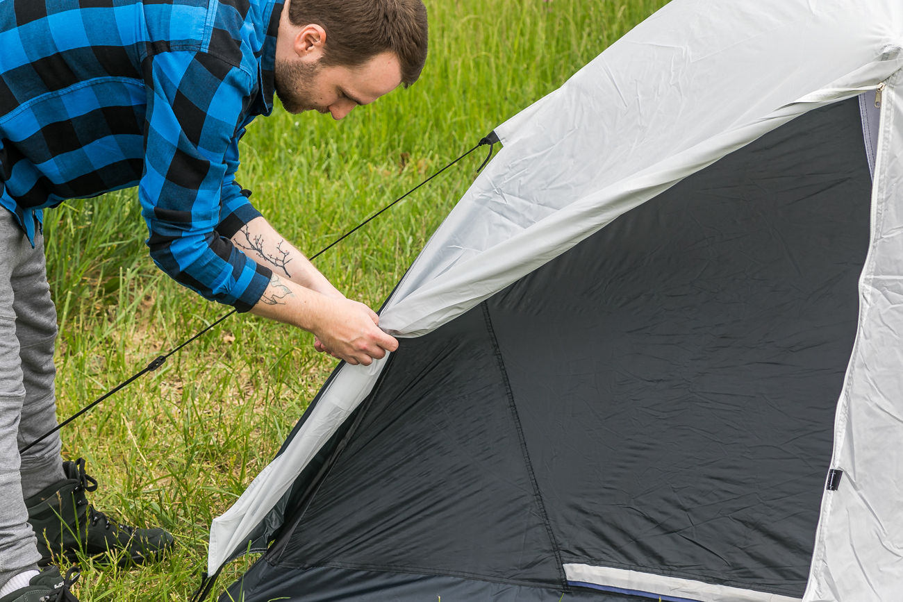 Stan pro 3 osoby - dvouplášťová kopule s předním a zadním vchodem (zavěšená ložnice a oddělený vrchní plášť)
