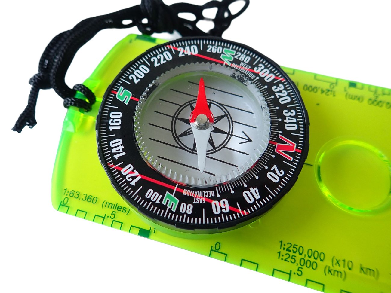 Buzola malá 114 x 62 mm. Buzola má směrovou šipku pro určení azimutu (úhlu pochodu), několik měřítek pro rychlé určení vzdálenosti na mapě a lupu pro čtení drobného textu.