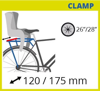 Špičková dětská sedačka na jízdní kolo s upínacím systémem CLAMP na nosič kola o šířce 120 - 175 mm je kvalitní model s velkými větracími otvory, vysokými bočnicemi na držení dětí.