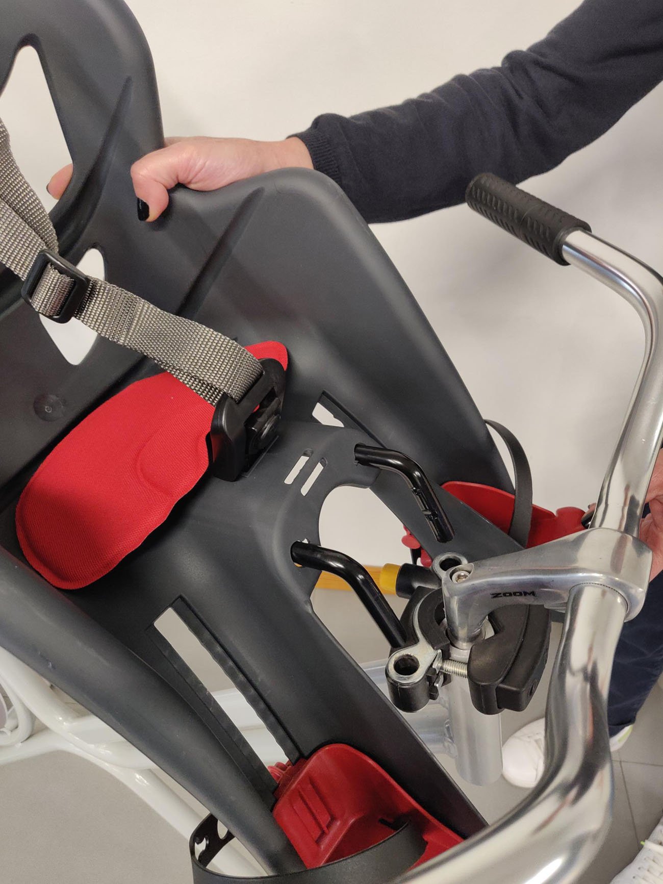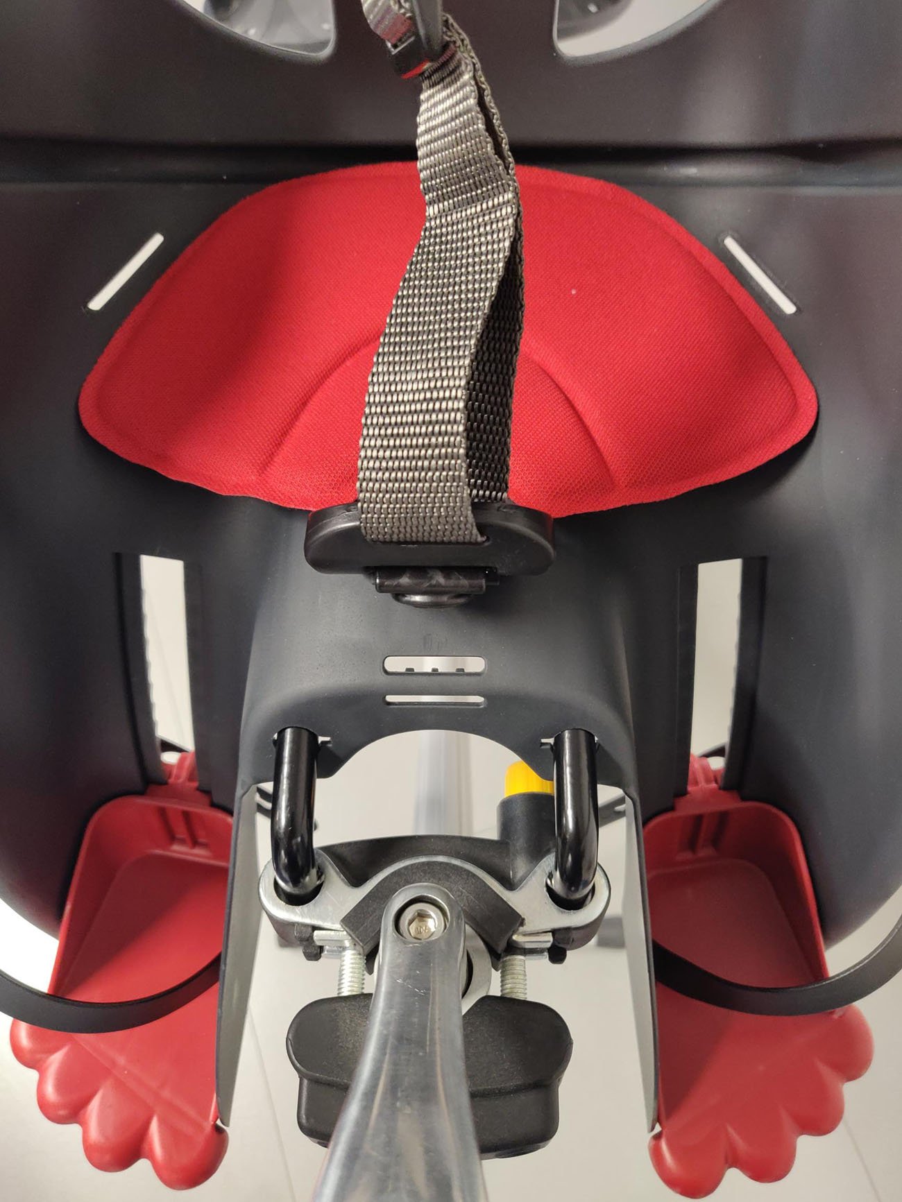 Špičková dětská sedačka na jízdní kolo s předním upínáním je kvalitní model s velkými větracími otvory, vysokými bočnicemi na držení dětí.