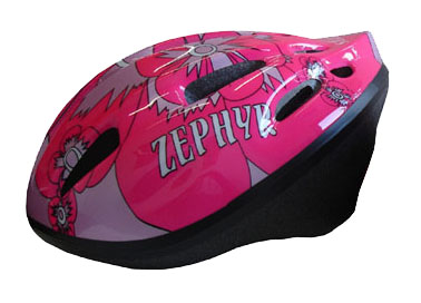 Cyklistická dětská helma s růžovým potiskem, 8 větracích otvorů, v přední části helmy je síťka proti hmyzu.