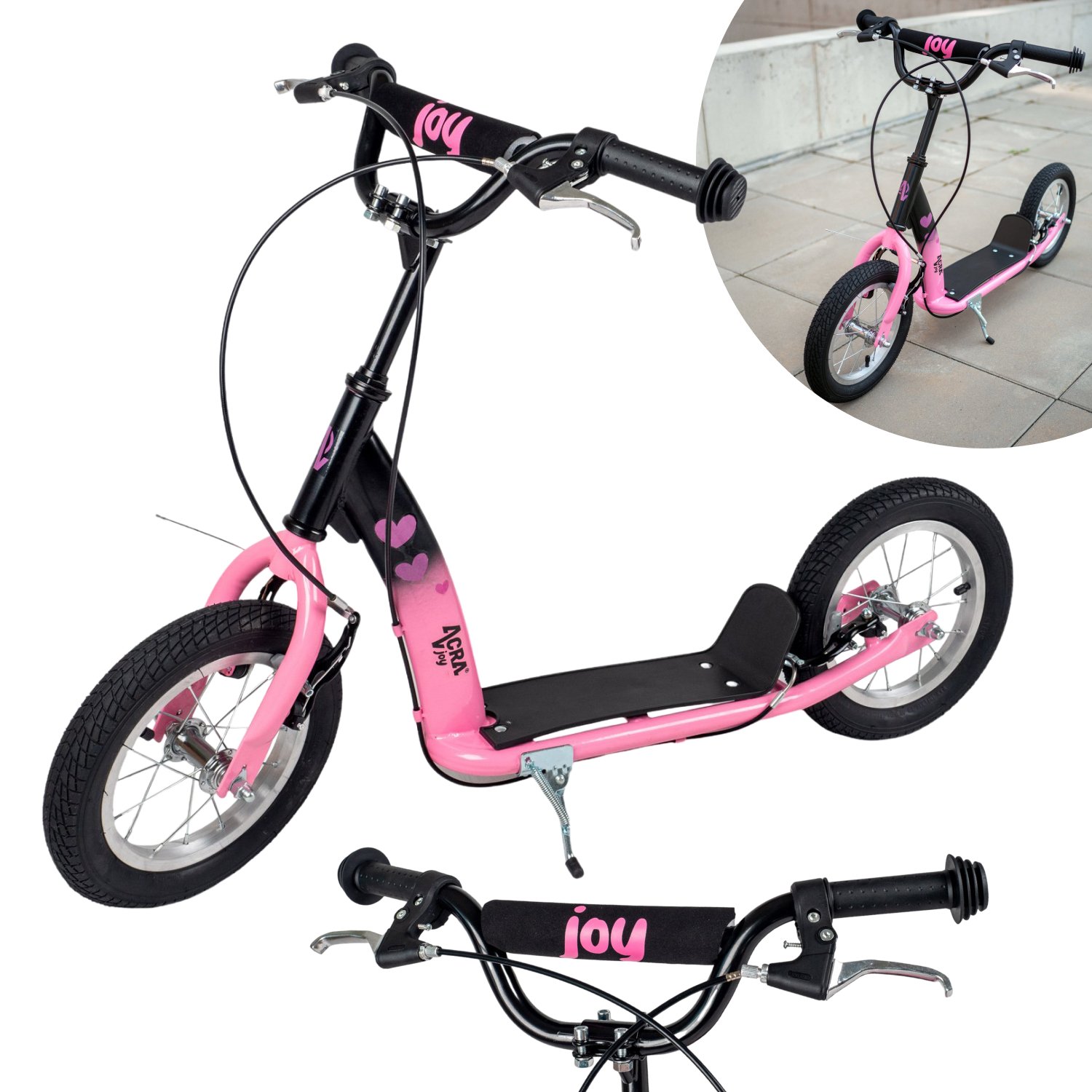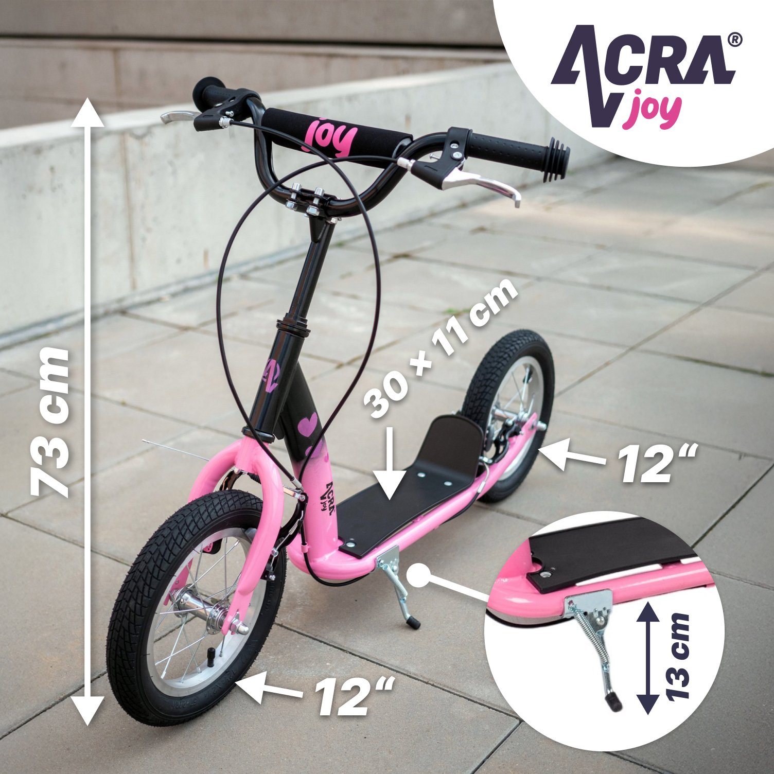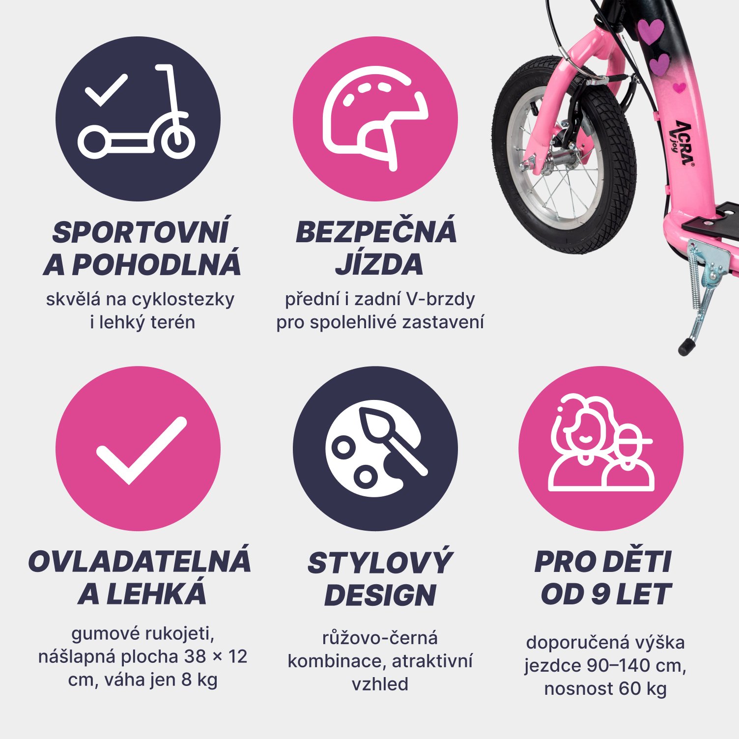 Koloběžka Acra Joy Grace je sportovní, pohodlná pro jízdu po silnici, cyklostezce i v menším terénu. Je vhodná pro jezdce všech úrovní a je ideální nejen pro dojíždění do práce nebo školy, ale i pro zábavu a volný čas i pro výlety do terénu.