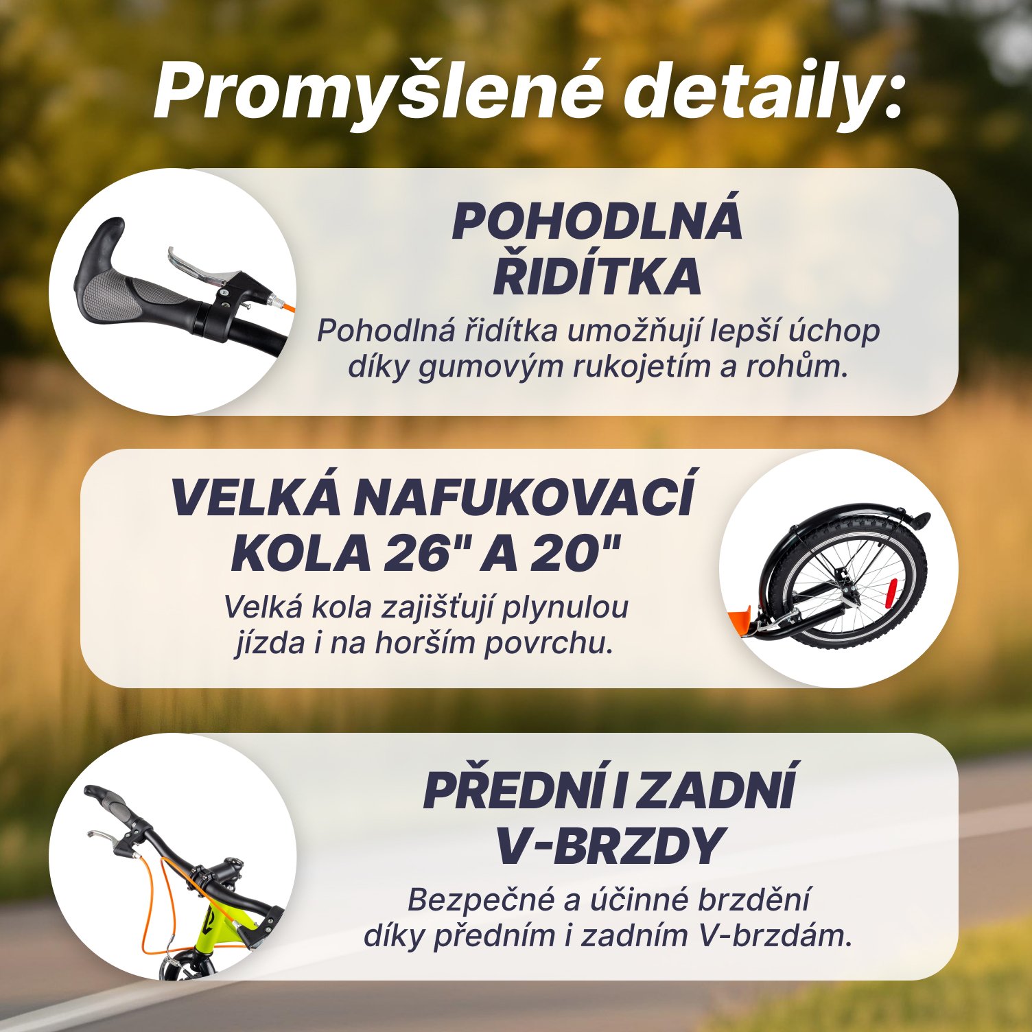 - Kola jsou nafukovací o rozměru 26“, 20“