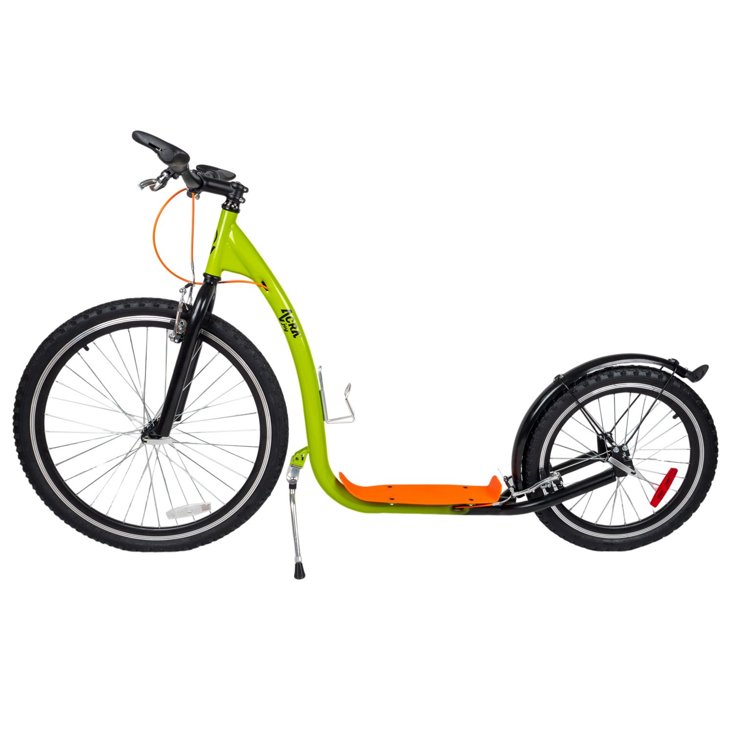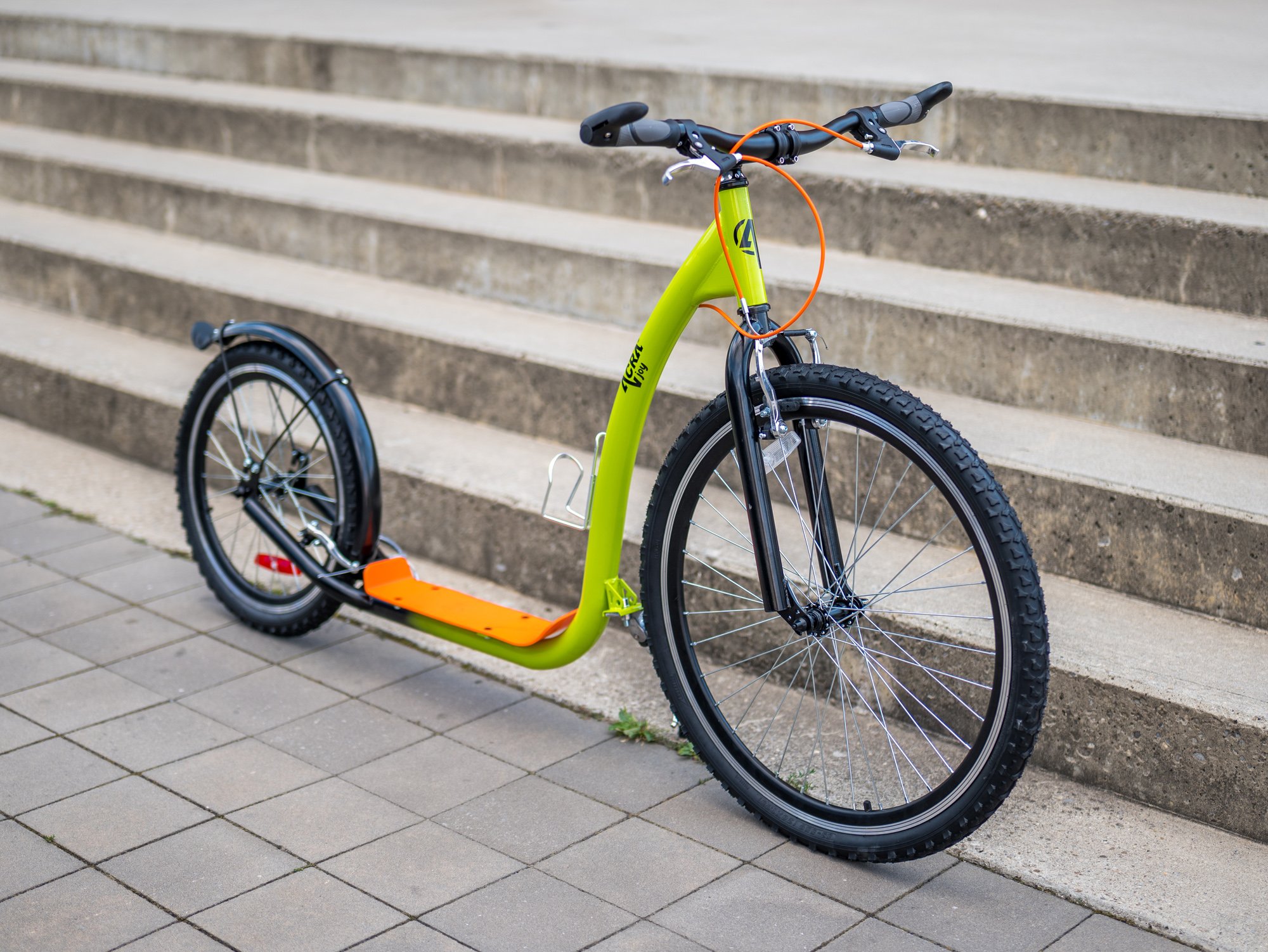 - Koloběžka má zeleno-oranžovou barvu.