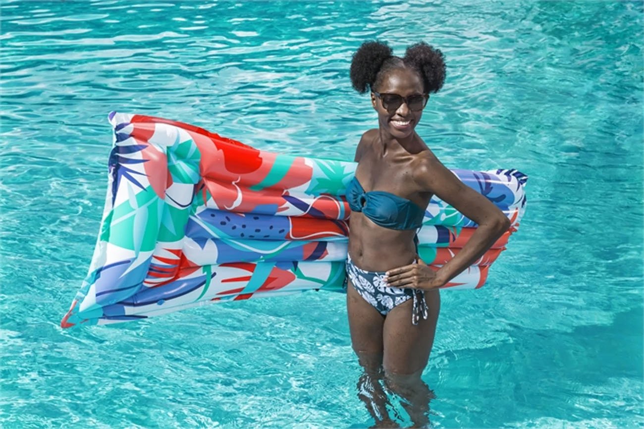 Nafukovací lehátko s barevným potiskem s květinovými vzory a s nafukovacím polštářem o rozměrech 183 x 69 cm. Lehátko má zesílené stěny pro větší odolnost proti poškození.