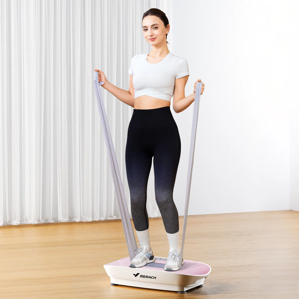 Velkou výhodou modelu MERACH 2398 je možnost komplexního tréninku horní i dolní poloviny těla. Součástí balení jsou odporové gumy, díky kterým lze během cvičení zapojit také paže, ramena a záda. Uživatel tak během jednoho krátkého tréninku aktivuje více svalových skupin současně, což zvyšuje efektivitu domácího cvičení.