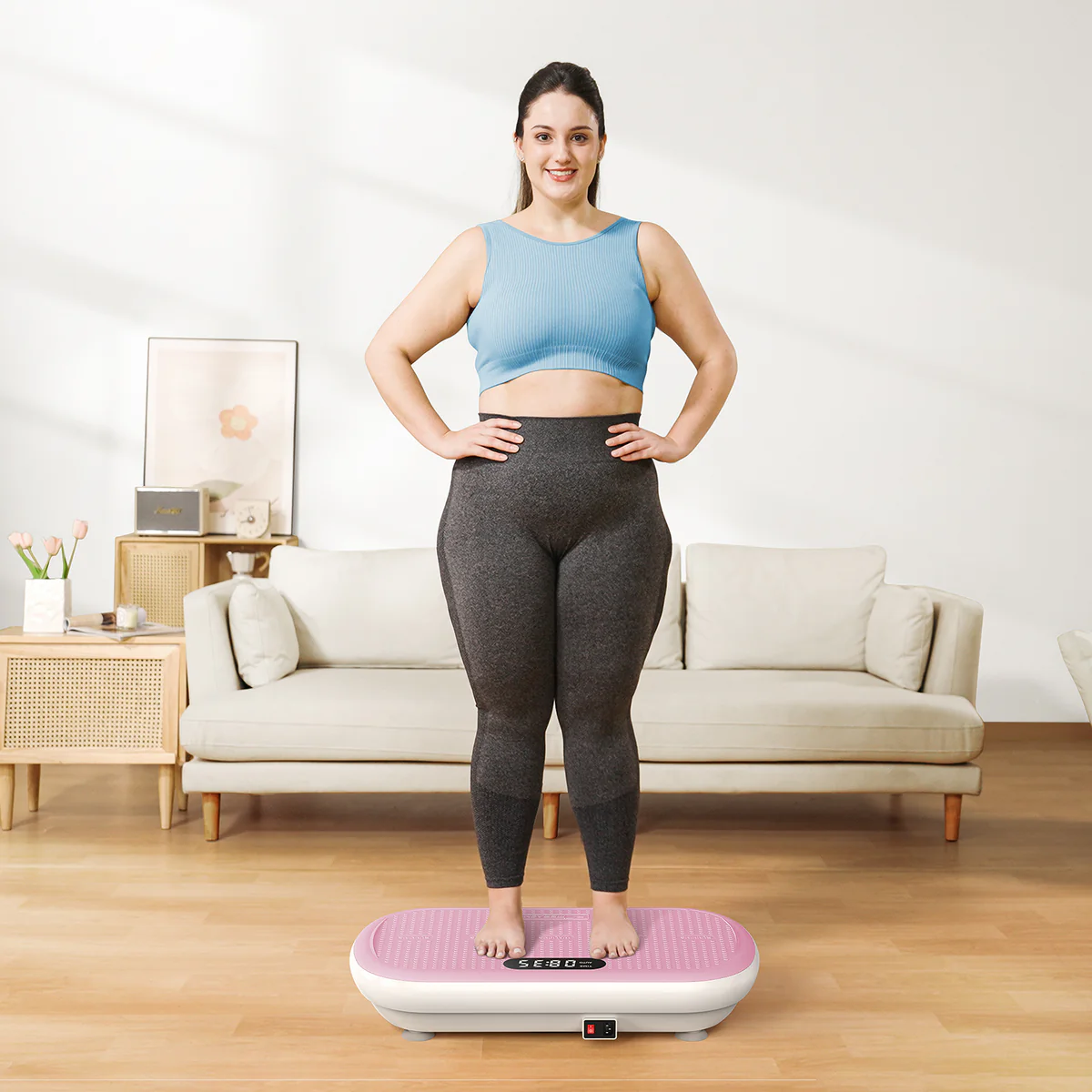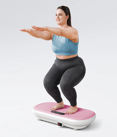 Silnější 200W motor vytváří vibrace s amplitudou až 13 mm, což přináší citelnější svalovou aktivaci než u běžných domácích vibračních podložek. Při cvičení dochází k přirozenému zapojení nohou, středu těla, hýždí i zad, a při použití odporových gum také horní poloviny těla. Díky tomu lze během krátké tréninkové jednotky procvičit více svalových partií současně bez potřeby dalšího vybavení.