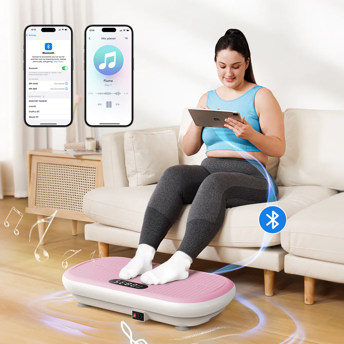 Zařízení nabízí 10 automatických režimů vibrací a 10 úrovní intenzity, takže si uživatel snadno nastaví režim podle kondice i cíle cvičení. Praktické dálkové ovládání umožňuje pohodlnou změnu nastavení během tréninku a LED displej zobrazuje aktuální čas, režim i intenzitu. Integrovaný Bluetooth reproduktor zpříjemňuje cvičení možností přehrávání hudby přímo z telefonu, což pomáhá udržet rytmus a motivaci při pravidelném používání.