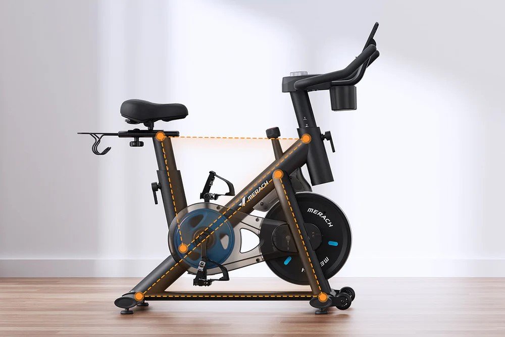 Stabilní konstrukce rámu Merach ve tvaru obráceného trojúhelníku zajišťuje maximální stabilitu. Díky technologii lisování z jednoho kusu a méně než pěti svařovacím bodům stroj snadno unese až 122 kg.
