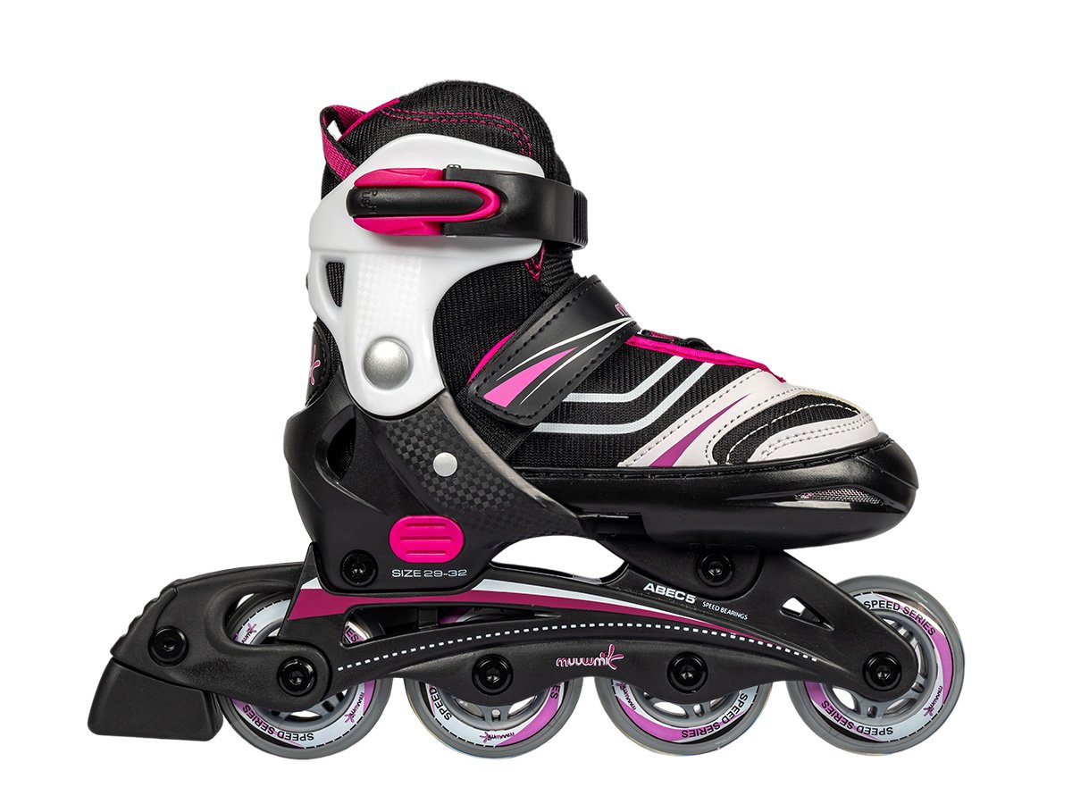 Užijte si hodiny zábavy a pohybu s těmito stylovými růžovými inline bruslemi Muuwmi, které jsou ideální pro malé bruslařky. Díky nastavitelným velikostem brusle porostou s vaším dítětem, takže se z nich bude moci těšit dlouhé roky.
