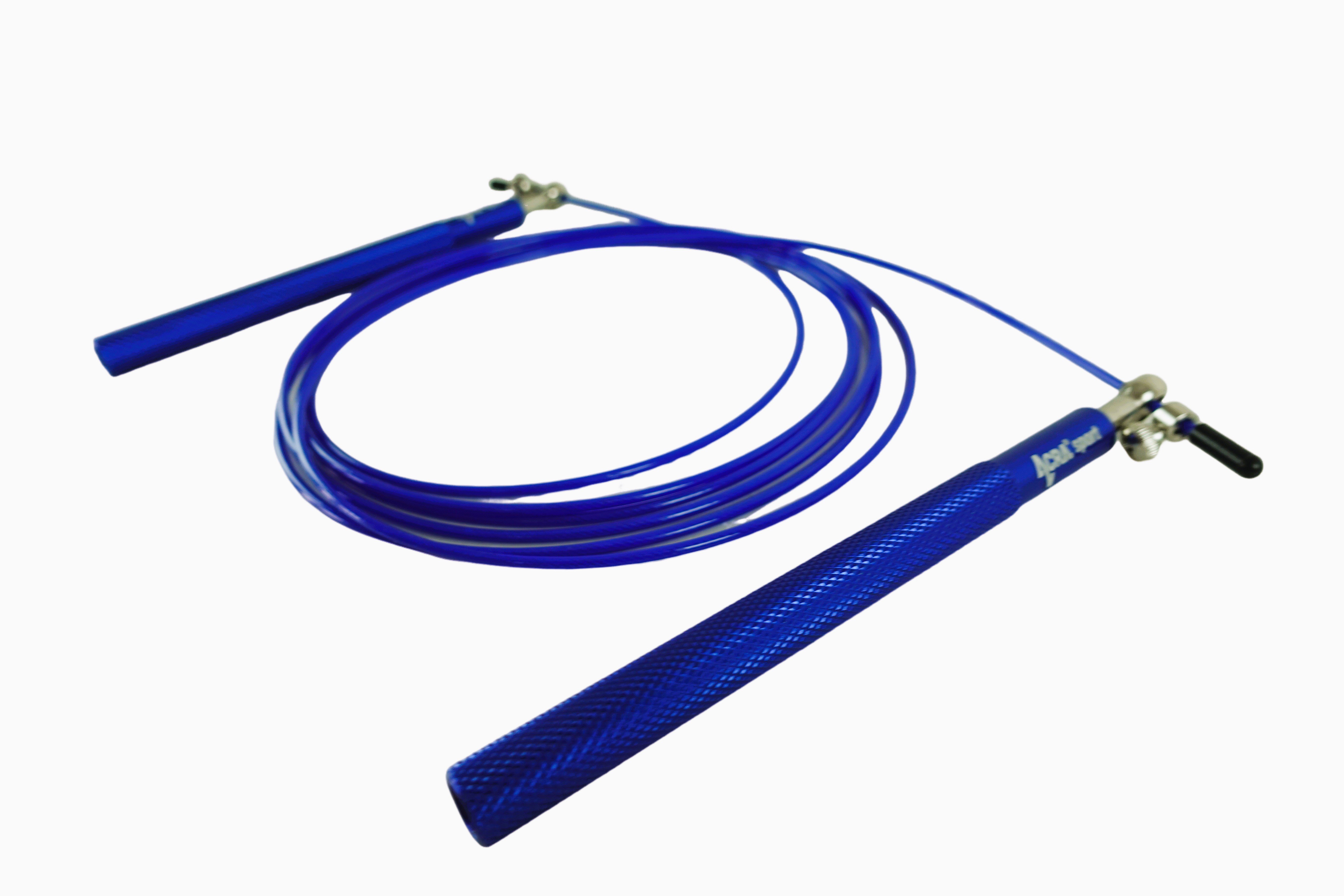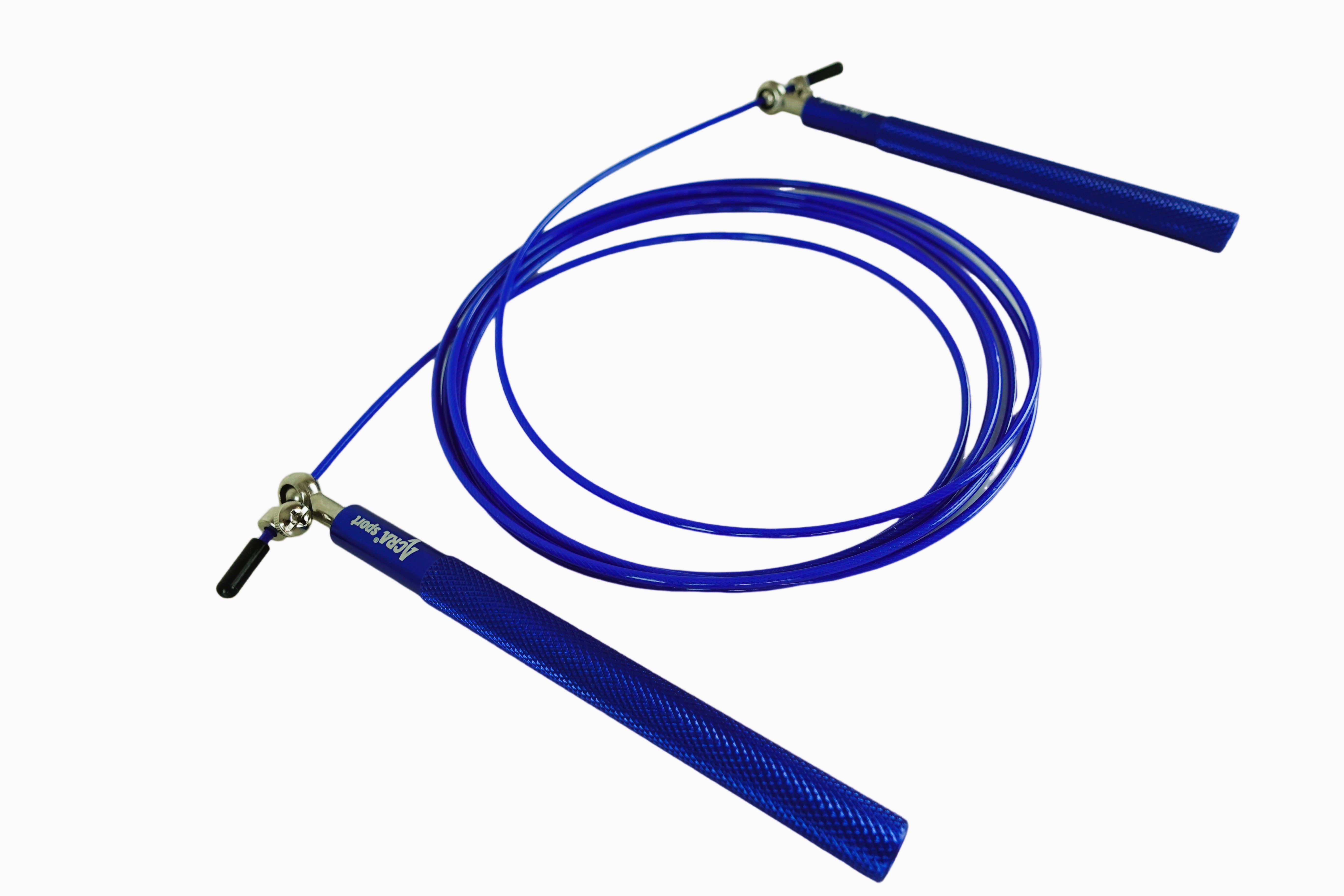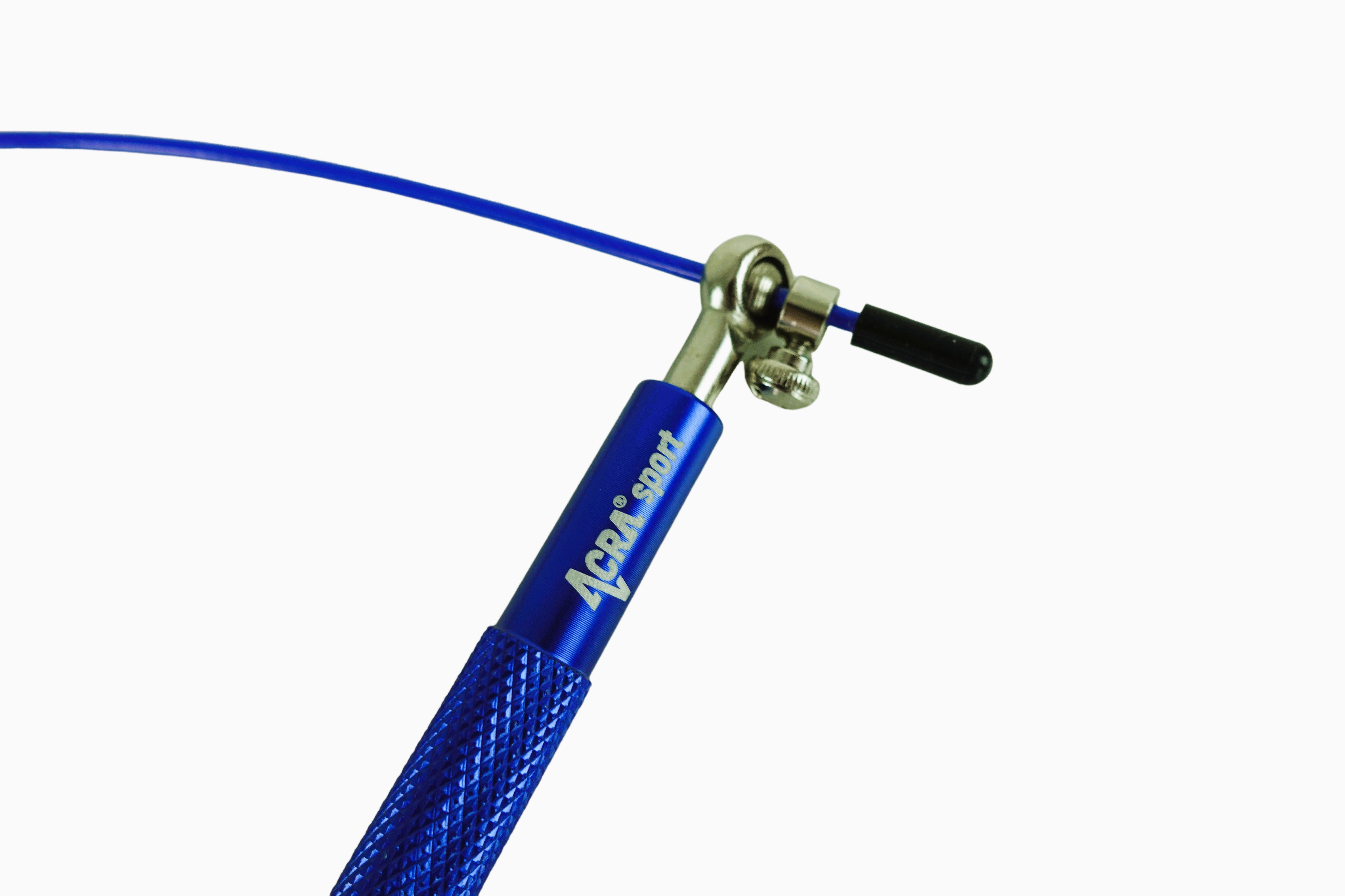 Švihadlo Acra modré Skipy je vynikající cvičební pomůckou pro zlepšení celkové kondice. Rukojeti, které jsou vyrobeny z pevného hliníku, mají protiskluzový povrch, což zajišťuje bezpečné a pohodlné uchycení. Kovová otočná ložiska s utahovacím šroubem umožňují snadné nastavení délky lanka dle potřeby. Samotné lanko má ocelové jádro chráněné gumovou bužírkou, a je zakončeno gumovými odnímatelnými pouzdry, které umožňují přesné zkrácení švihadla.