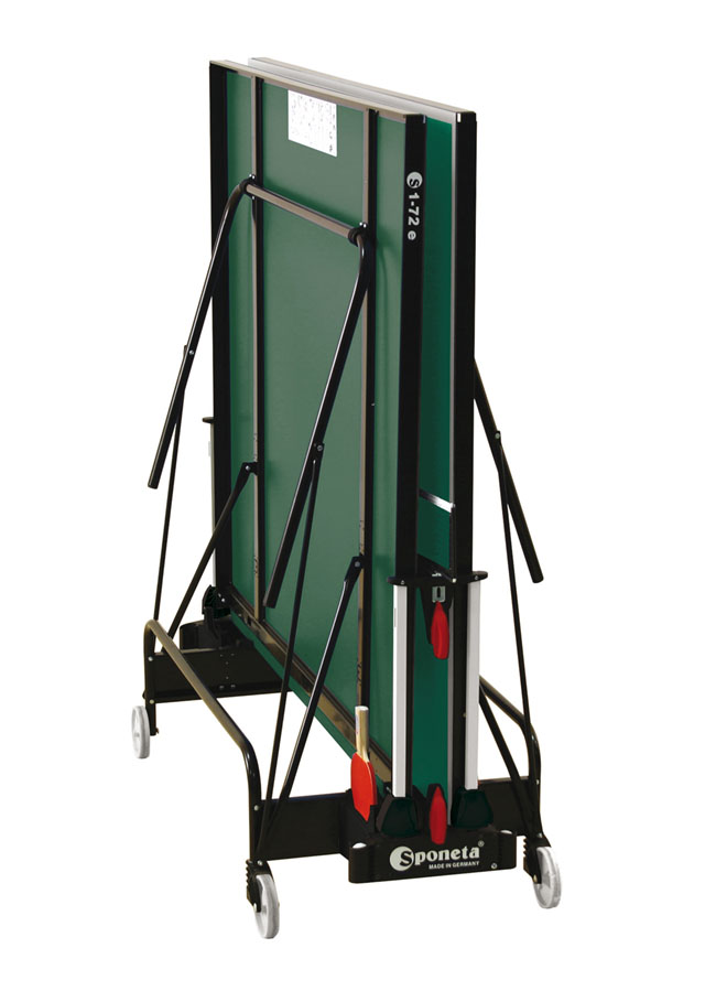 Stůl na stolní tenis Sponeta S1-72e, venkovní má pozinkovaný rám a 4 mm silnou plastovou desku (z melaminu), která má vlastnosti klasické dřevěné desky a umožňuje stálé umístění stolu venku (přesto doporučujeme pro prodloužení životnosti nechávat stůl venku pouze od jara do podzimu - sníh a led mohou stůl mechanicky poškodit) bez ohledu na momentální klimatické podmínky.