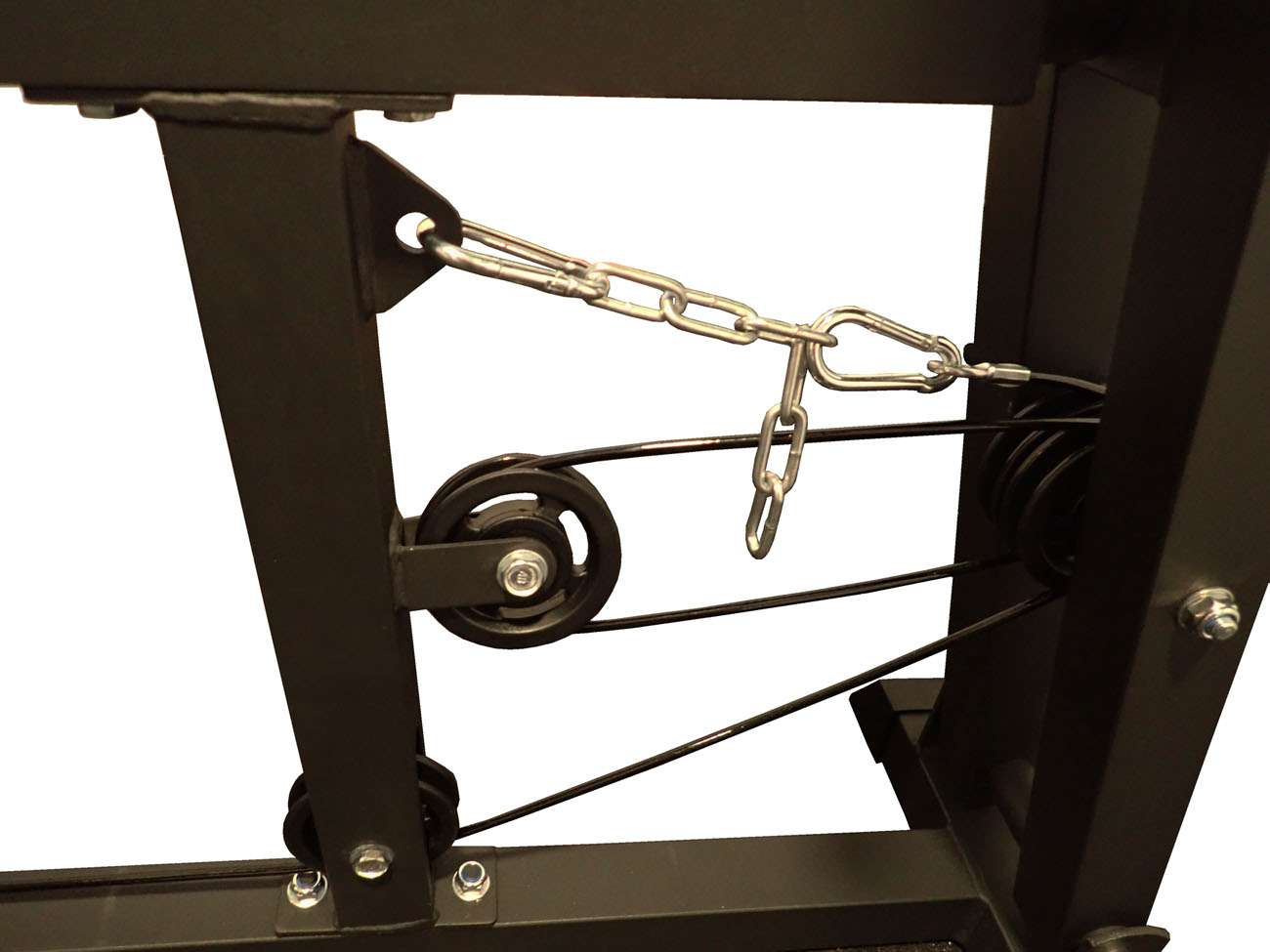 - strojová zpevněná ložiska ve všech kladkách - speciální ocelová lana o průměru 5 mm určená pro velkou zátěž s umělohmotným potahem proti opotřebení