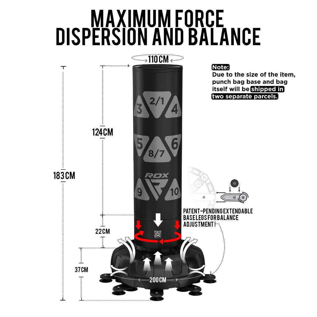 - Patentovaná stabilita Octa-Truss™: Zapomeňte na "cestující" pytle. Revoluční osminohá základna s přísavkami (patentovaná technologie) se zaryje do podlahy a udrží pytel pevně na místě i pod palbou těch nejničivějších kombinací. Základnu naplníte až 120 kg písku (nebo 80 l vody).