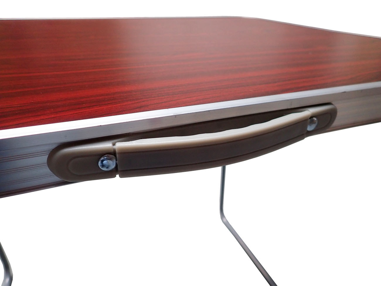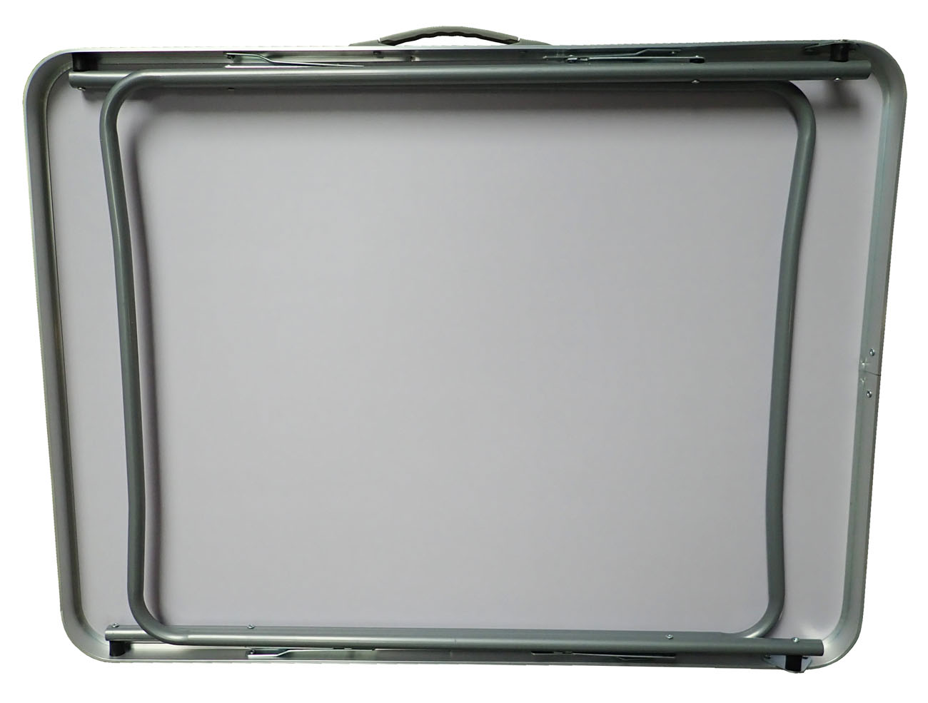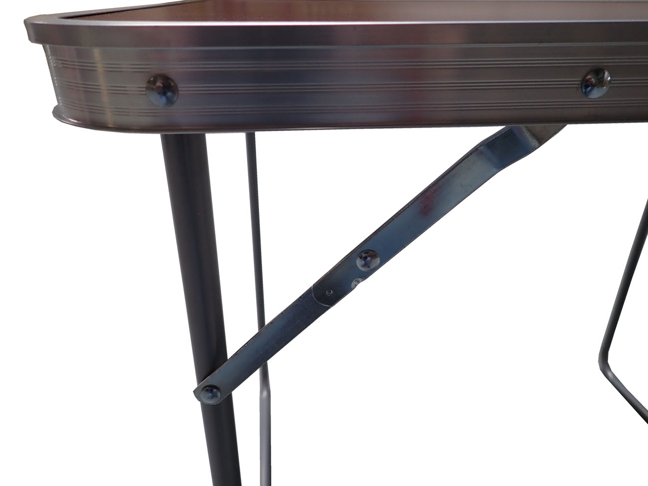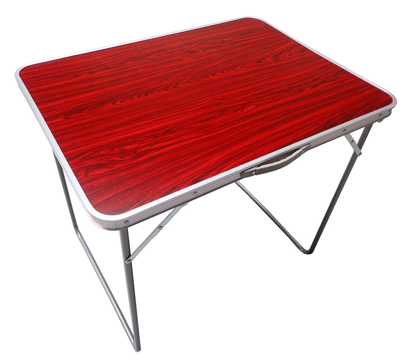 Skládací kempingový strolek 80 x 60 x 70 cm se dvěma sklápěcími nohami opatřenými páčkovými aretacemi po obou stranách stolu.
