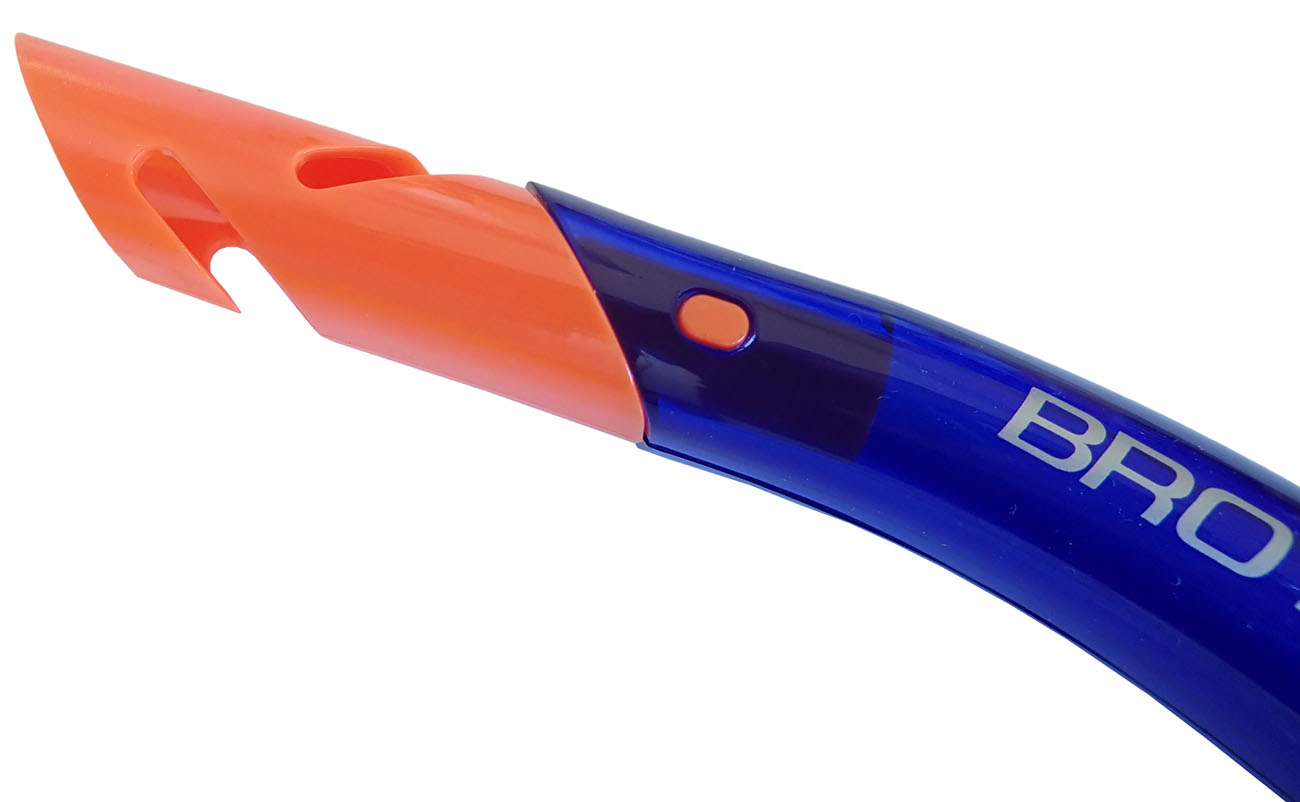 Šnorchl s vyfukovacím ventilem a krytkou proti vodě - balení blistr, s vrchní krytkou proti vodě a výfukem. Materiál - silikon + polyetylen.