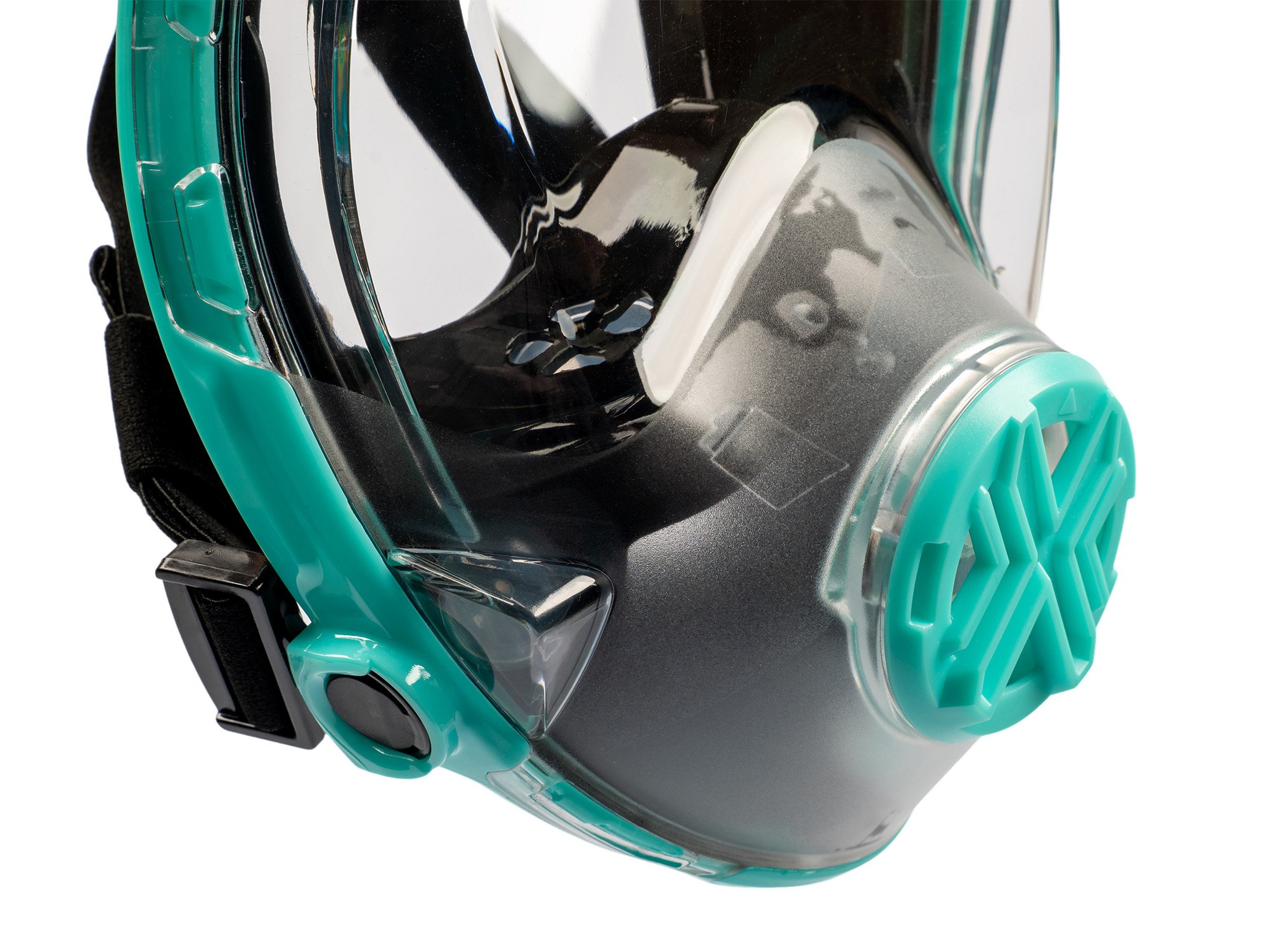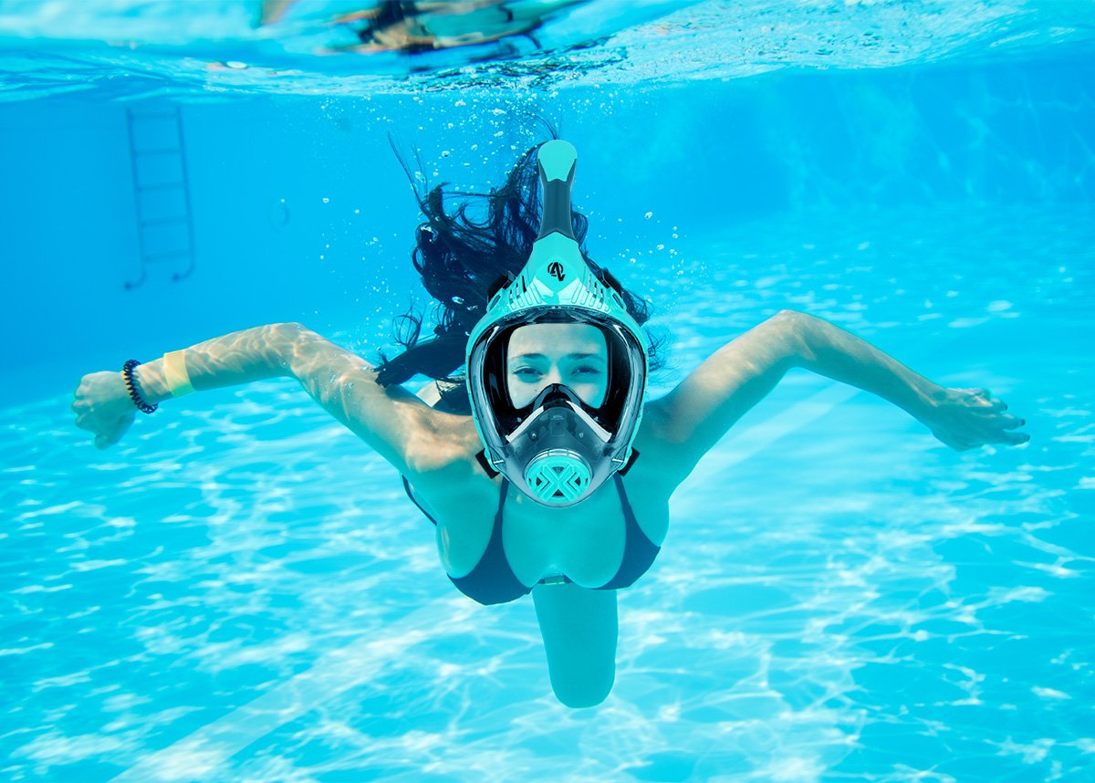 • Bezpečný dýchací systém - Šnorchlovací maska má zcela oddělený okruh pro přívod čerstvého vzduchu a odvod vydechovaného vzduchu, což účinně zabraňuje opětovnému vdechování vydechovaného oxidu uhličitého a snižuje riziko nepohodlí v důsledku nesprávného příjmu.