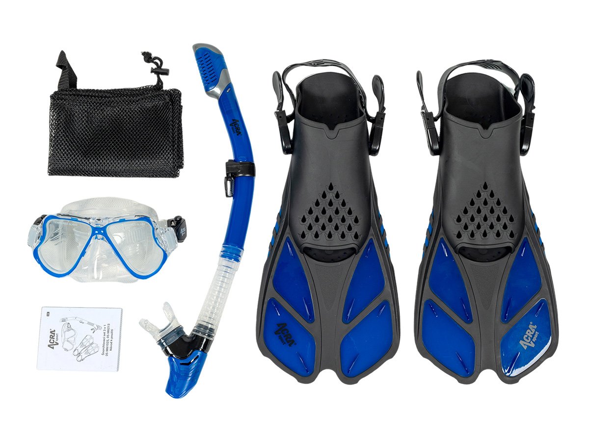 Sada šnorchlu Acra Sport s nastavitelnými ploutvemi, maska z tvrzeného skla se dvěma průhledy, silikonový šnorchl Dry Top a cestovní taška na vybavení. Šnorchlovací set Acra je dokonalý společník na cesty a je vhodný pro šnorchlování, plavání, potápění a mnoho dalšího.
