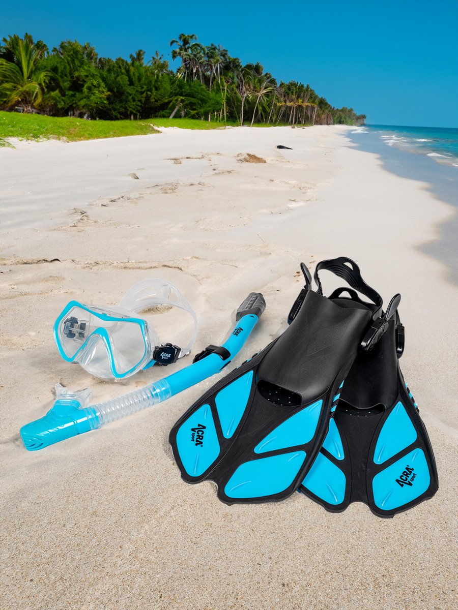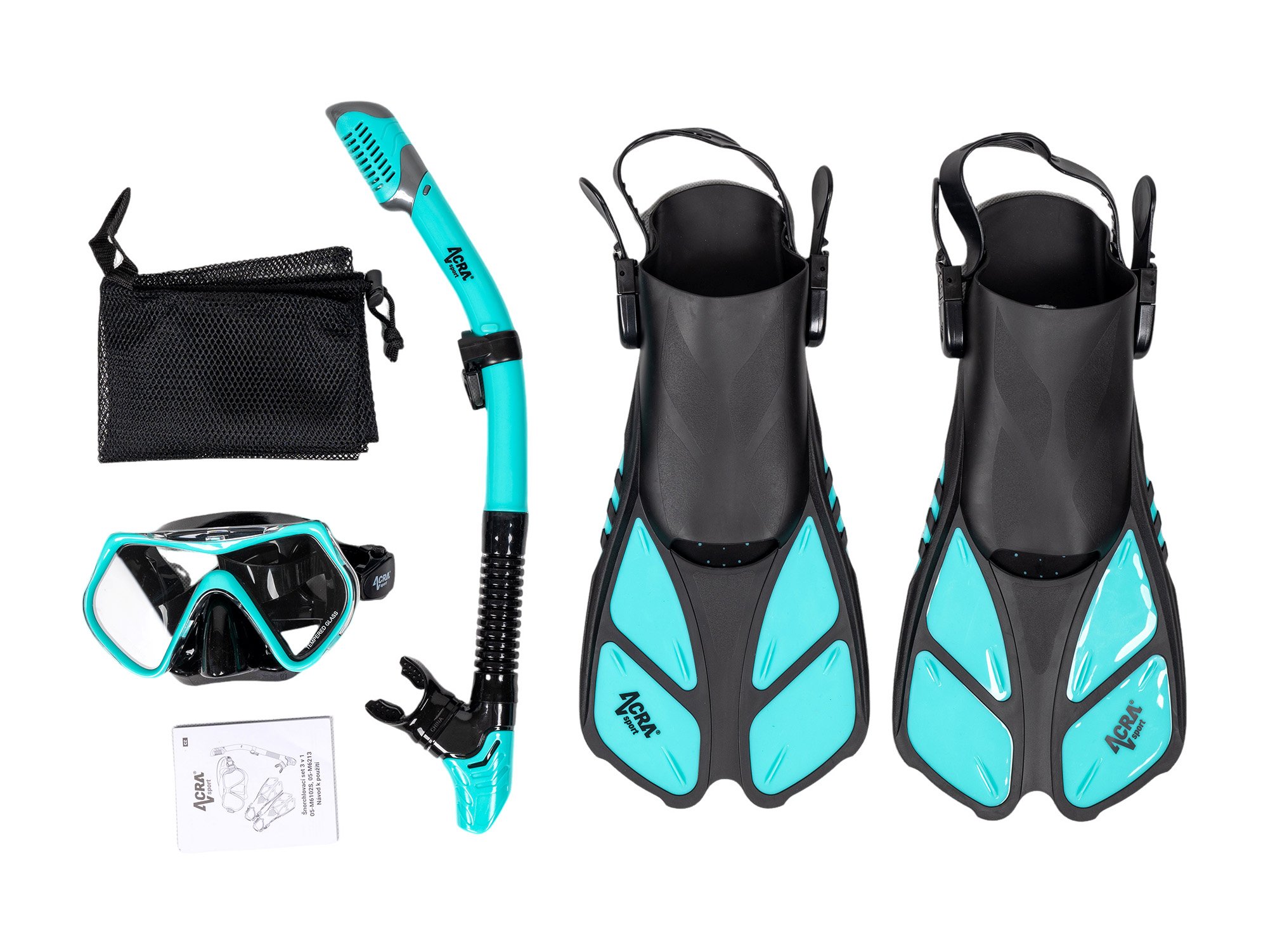 Sada šnorchlu Acra Sport s nastavitelnými ploutvemi, maska z tvrzeného skla se dvěma průhledy, silikonový šnorchl Dry Top a cestovní taška na vybavení. Šnorchlovací set Acra je dokonalý společník na cesty a je vhodný pro šnorchlování, plavání, potápění a mnoho dalšího.